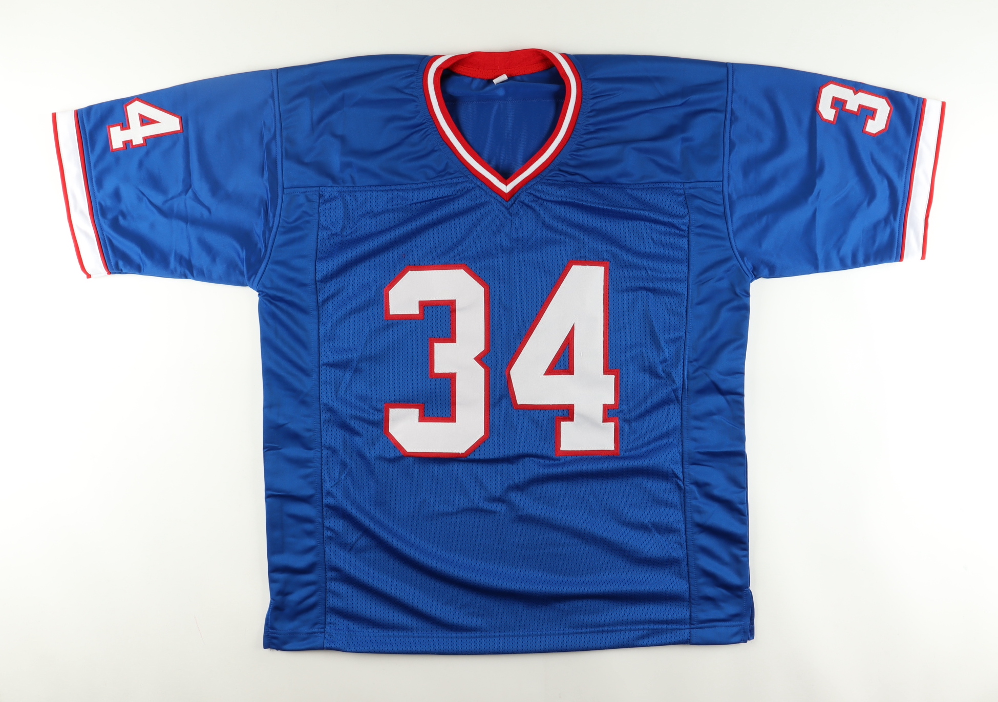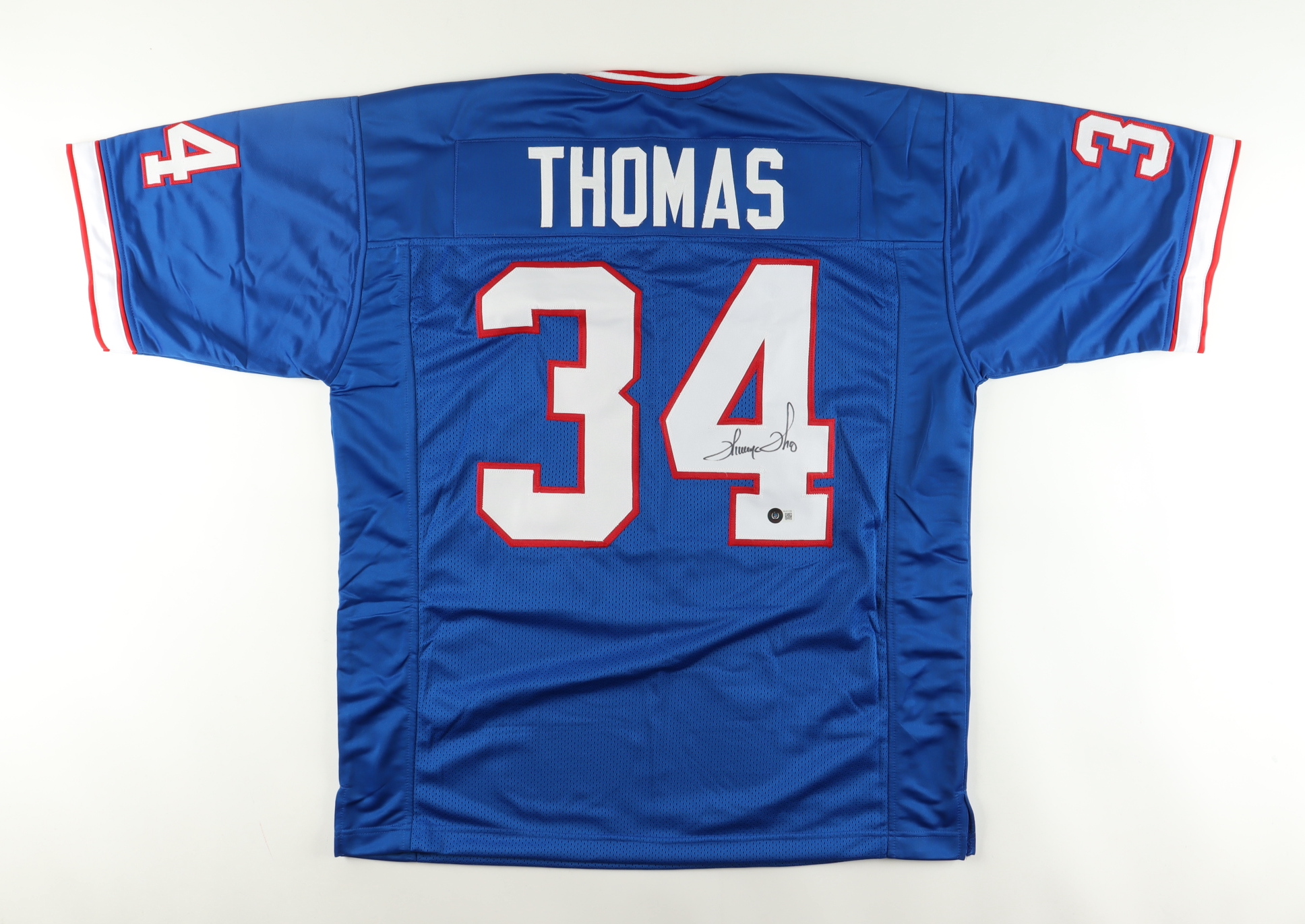 Custom on-field style jersey. Everything is sewn on, size XL. Hand-signed by Thurman Thomas (HOF).