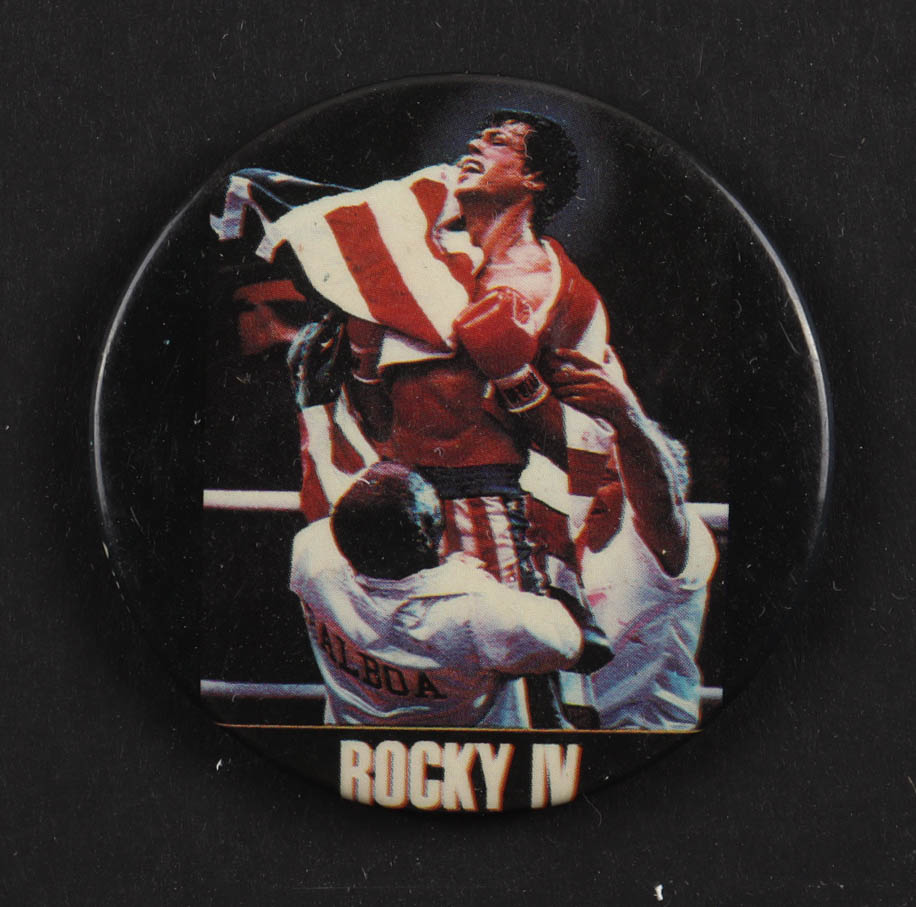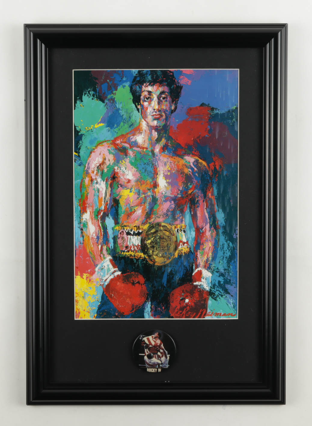 Custom frame measures 13" x 19" in size and features a print of LeRoy Neiman's "Rocky." Display also features a "Rocky IV" movie pin.