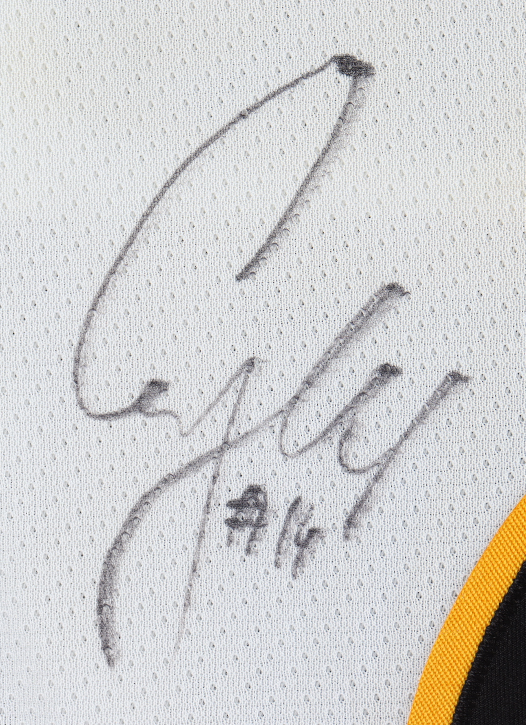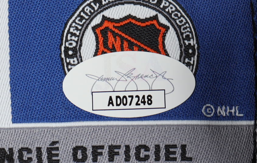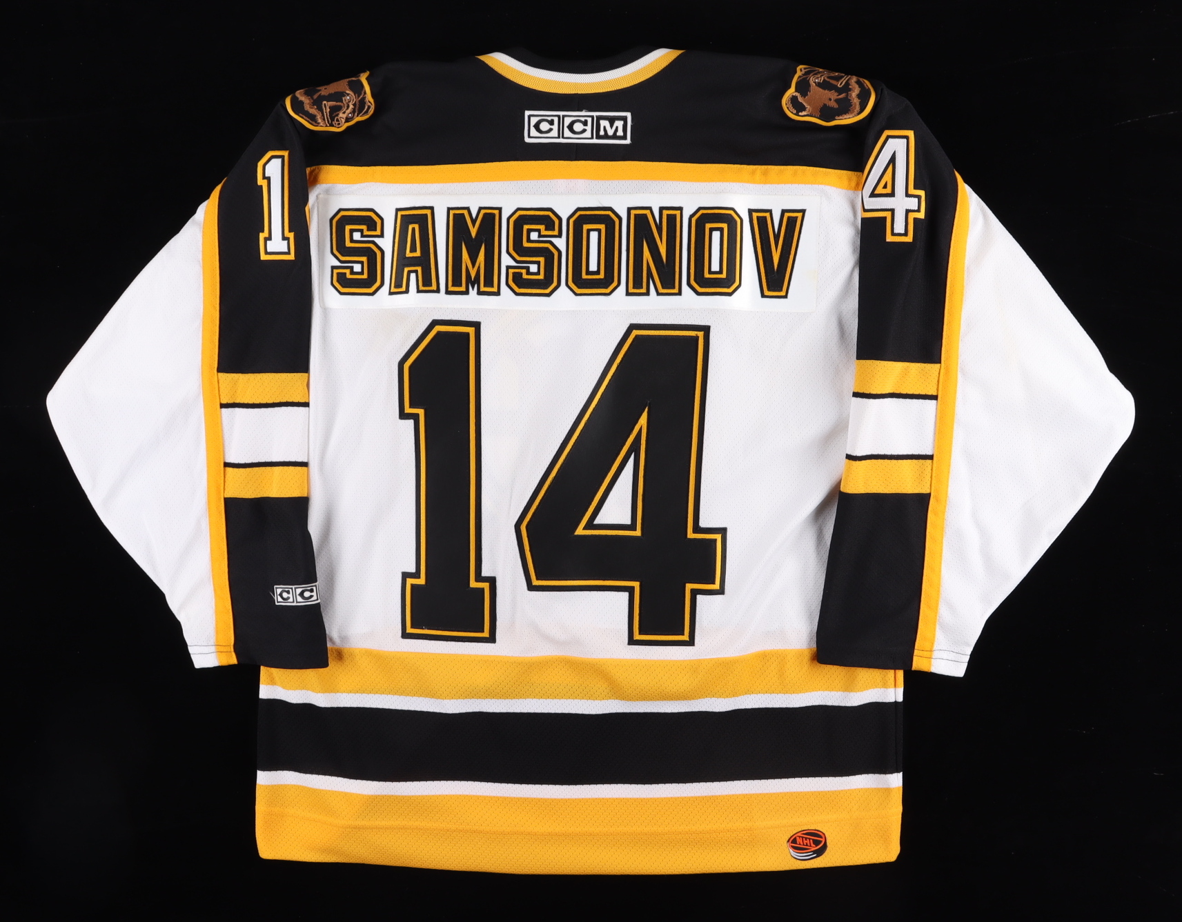 On-ice style jersey. Everything is sewn on, size L. Hand-signed by Sergie Samsonov.