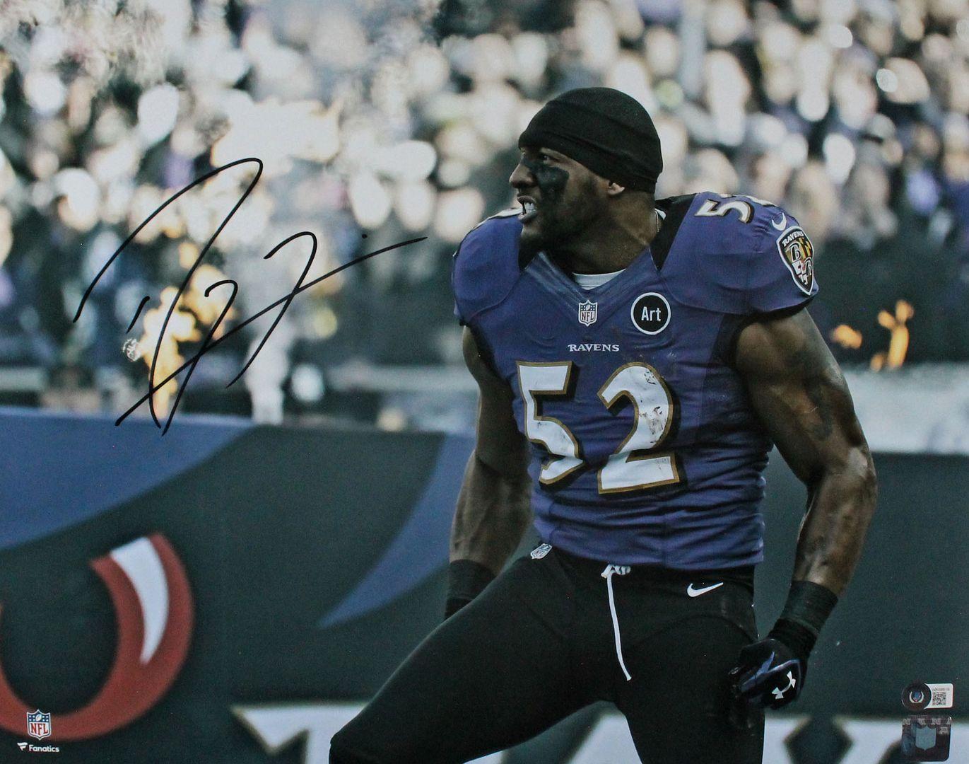 Photo measures 16" x 20" in size and has been hand-signed by Ray Lewis (Baltimore Ravens, HOF).