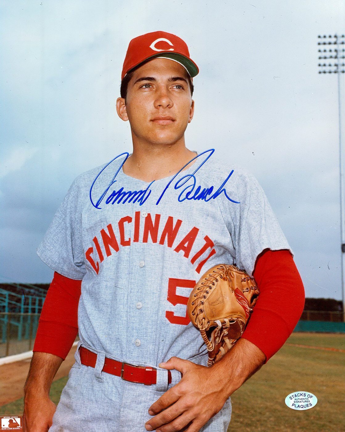 Photo measures 8" x 10" in size and has been hand-signed in blue felt-tip pen by Johnny Bench (HOF, Reds).