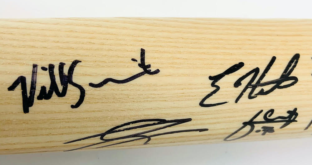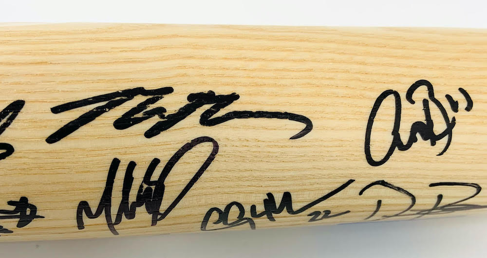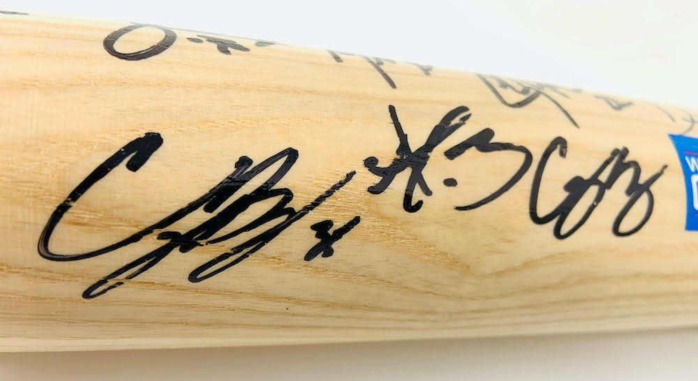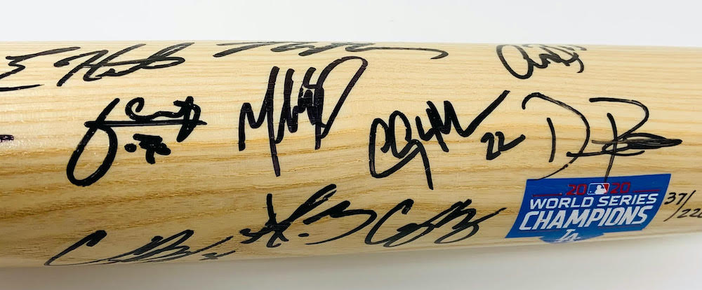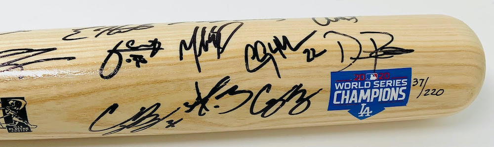 2020 World Series logo baseball bat has been hand-signed by (12) members of the Los Angeles Dodgers 2020 World Series championship team including Austin Barnes, Dustin May, Clayton Kershaw, Cody Bellinger, Corey Seager, Dave Roberts, Enrique Hernandez, Gavin Lux, Julio Urias, Max Muncy, Mookie Betts and Will Smith. The baseball bat is limited edition hand-numbered #/220.