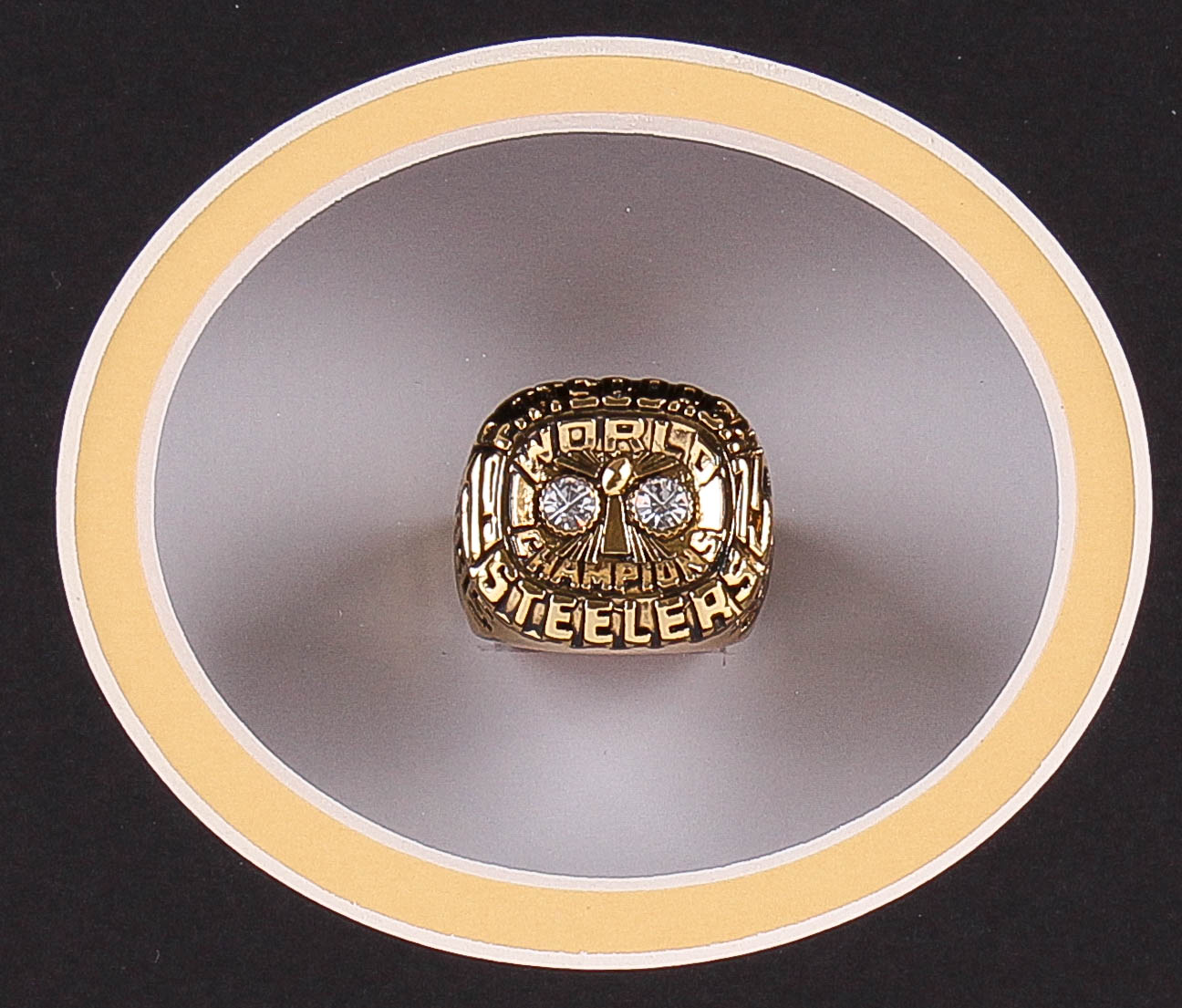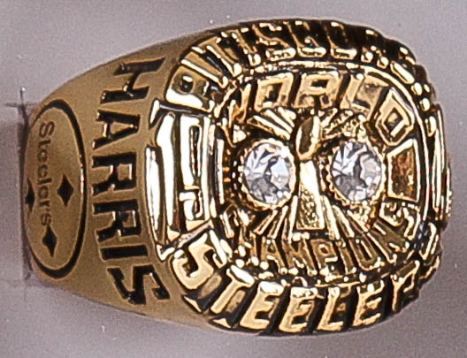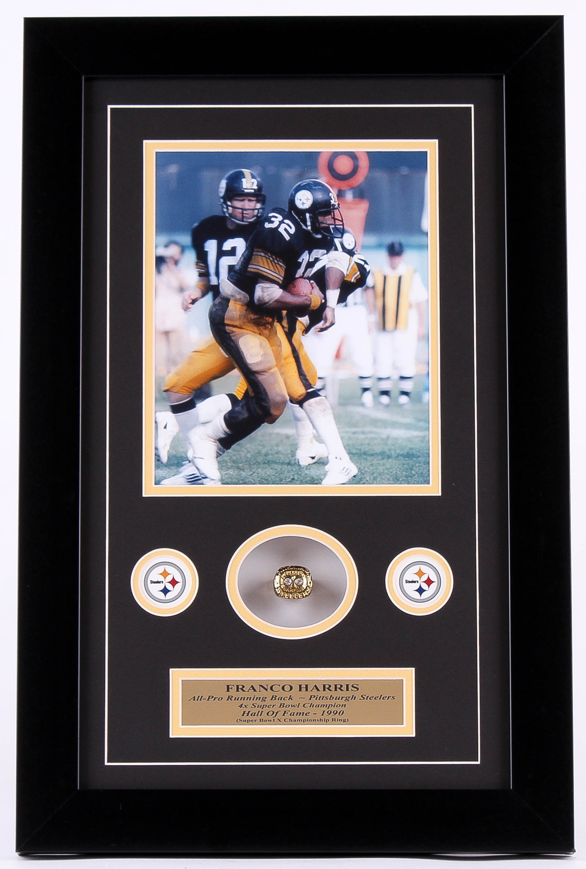 Custom framed championship ring display measures 14" x 22" in size and features a Franco Harris Pittsburgh Steelers High Quality Replica Super Bowl IX Championship Ring. The display also contains an 8" x 10" photo of Franco Harris (Steelers, HOF).