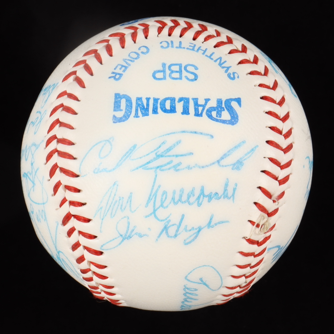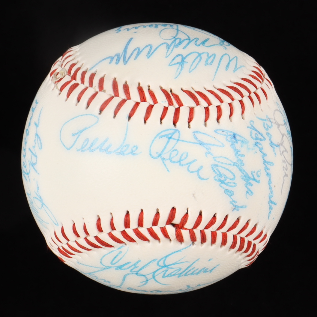 Spalding Brooklyn Dodgers Logo Baseball. Hand-signed by Pee Wee Reese, Tom Lasorda, Carl Furillo, Sandy Koufax, George Shuba, Billy Loes, Joe Black, Carl Erskine, Sandy Amoros, Roger Craig, Johnny Podres, Don Bessent, Jim Hughes, Walt Moryn, Rube Walker and (7) others.