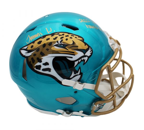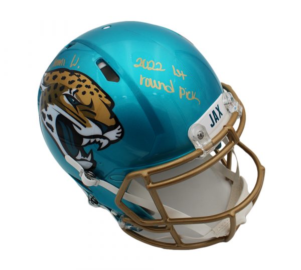 Riddell Jacksonville Jaguars full-size authentic on-field flash alternate Speed helmet. Hand-signed by Travon Walker.