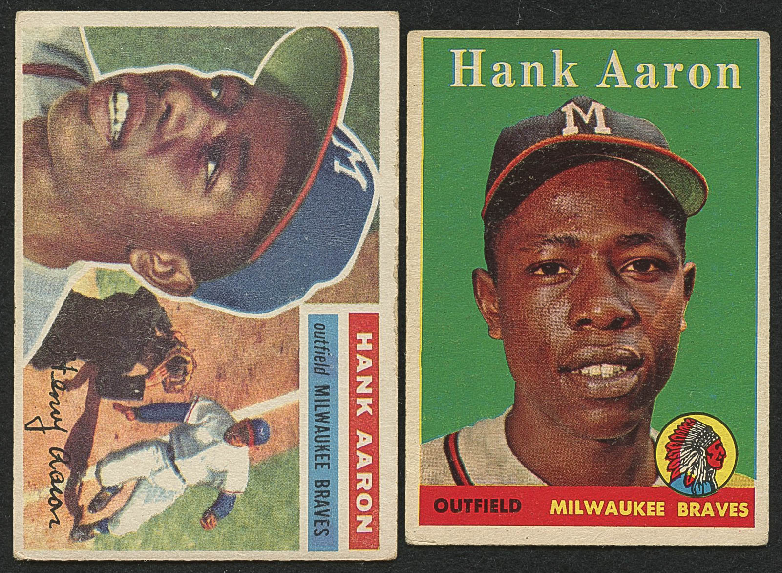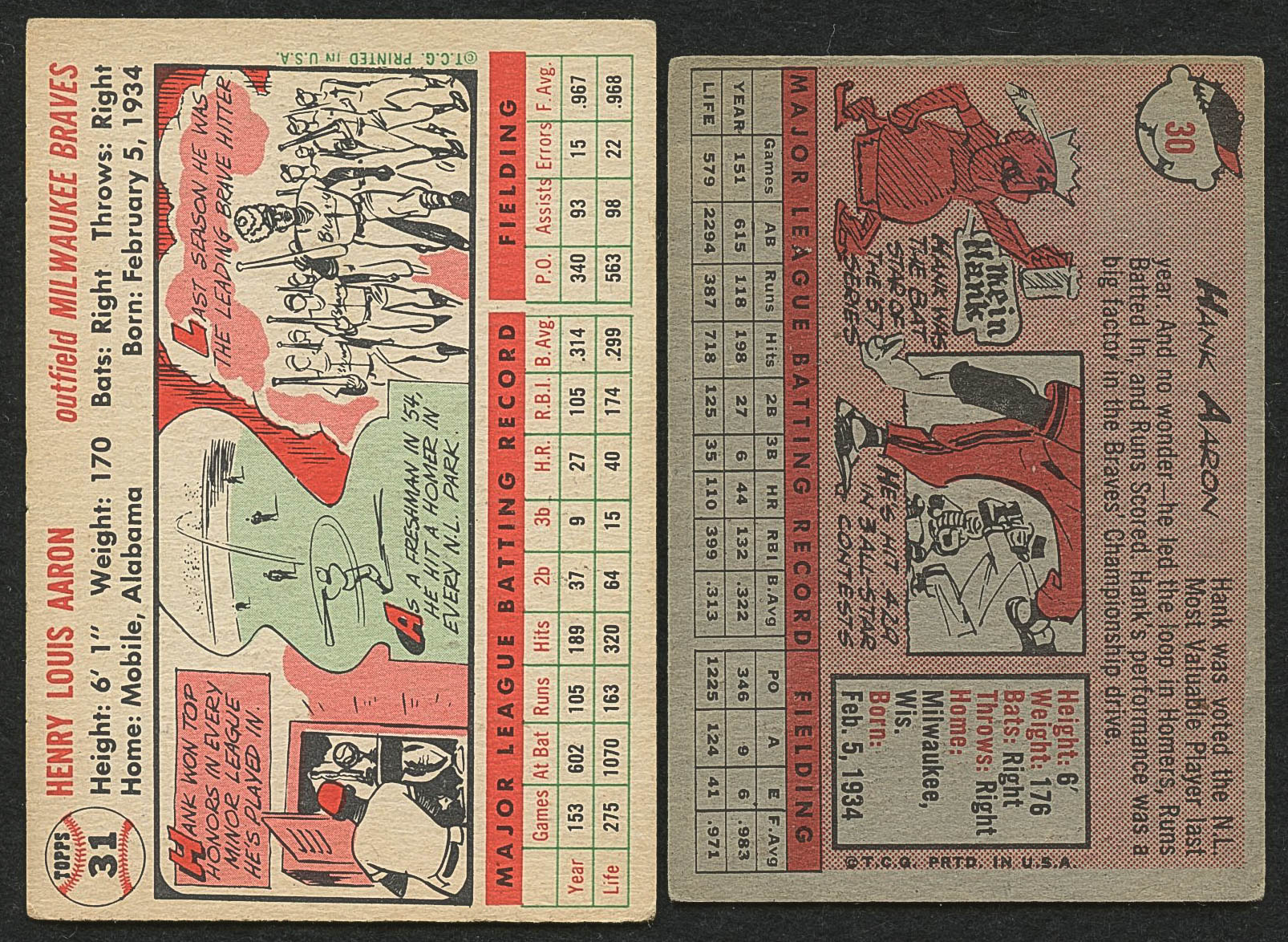 Lot of (2) Hank Aaron Baseball Cards with 1958 Topps #30A Hank Aaron & 1956 Topps #31 Hank Aaron