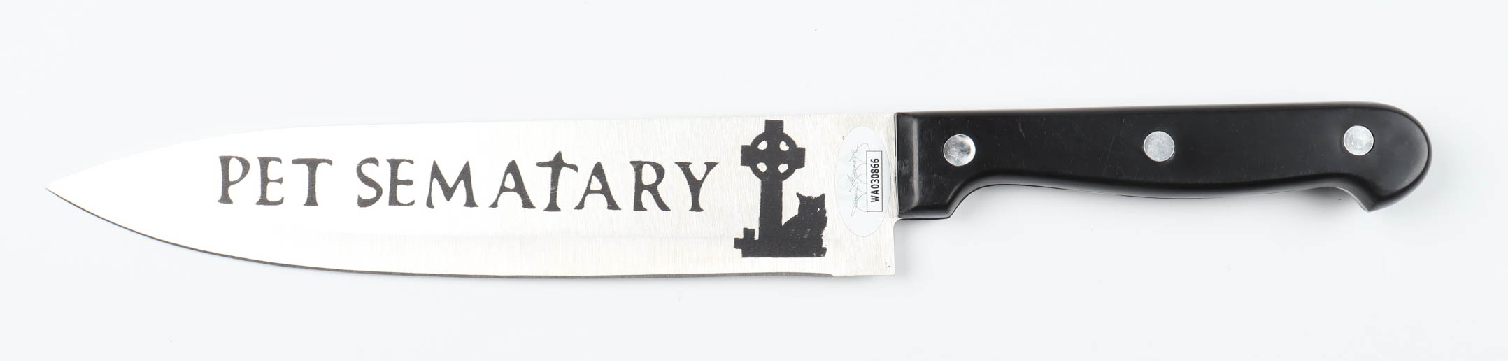 Chef Craft "Pet Sematary" logo kitchen knife measures approximately 12.5" in length and has been hand-signed and inscribed by Spencer Charnas. Please note, this is a real knife with a sharp blade.