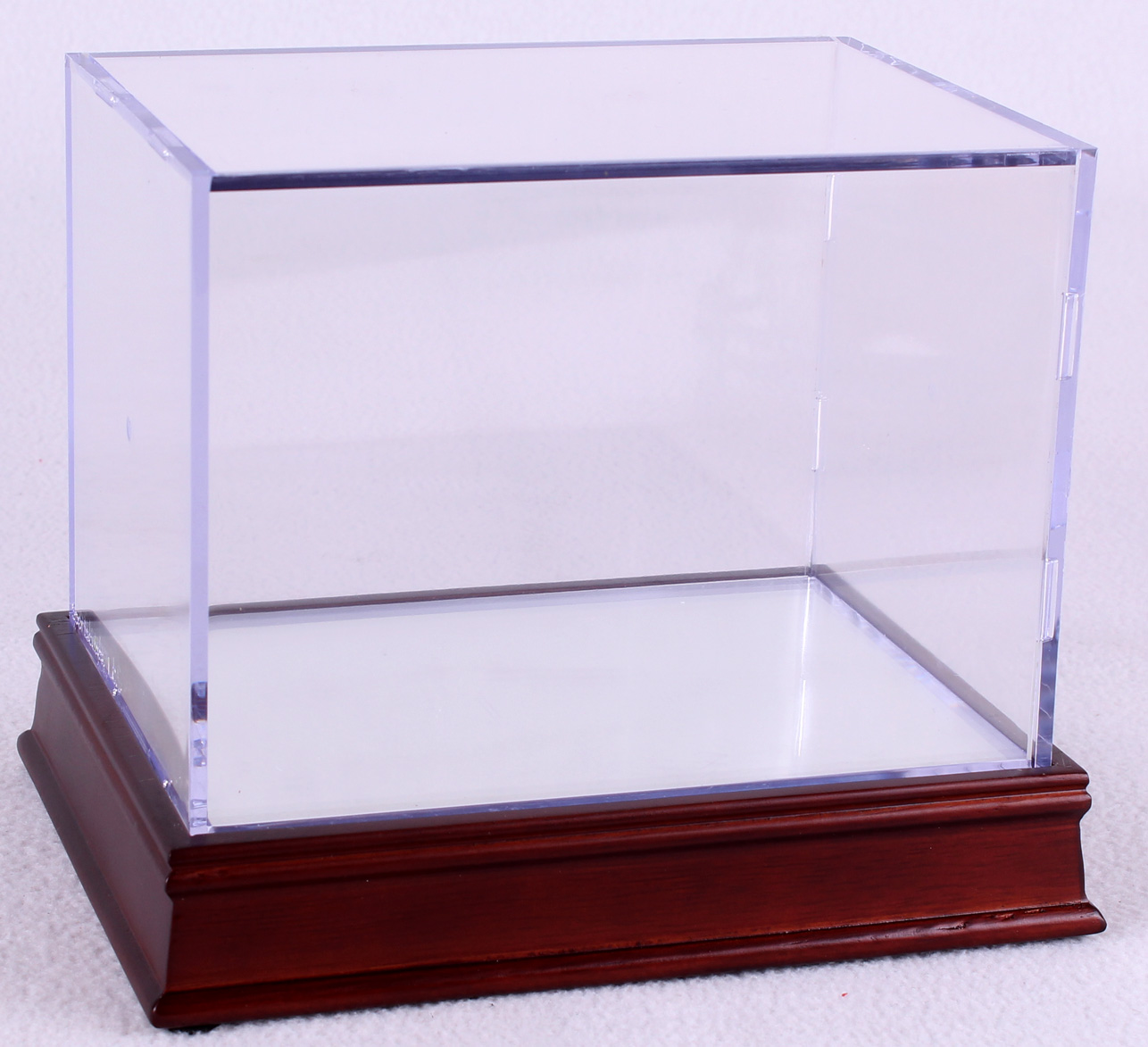 The BallQube Mini-Helmet Display is made of high impact, crystal clear polystyrene and features a 2 piece design. Holds football or hockey goalie mini-helmets. The BallQube sits atop a wooden base with a dark mahogany stain and mirrored bottom. Made in the USA.