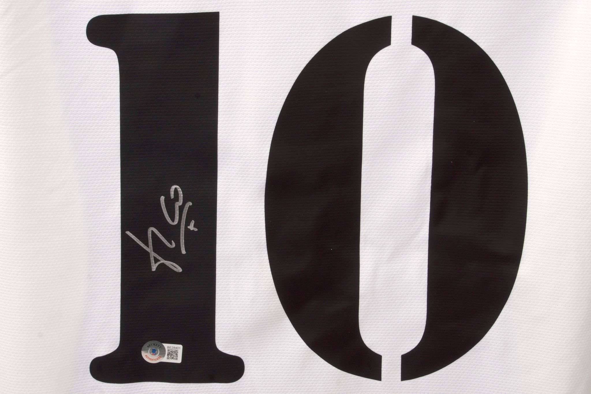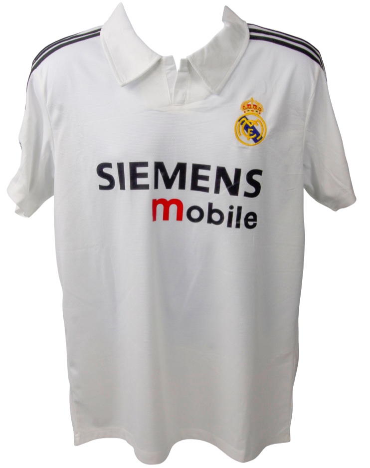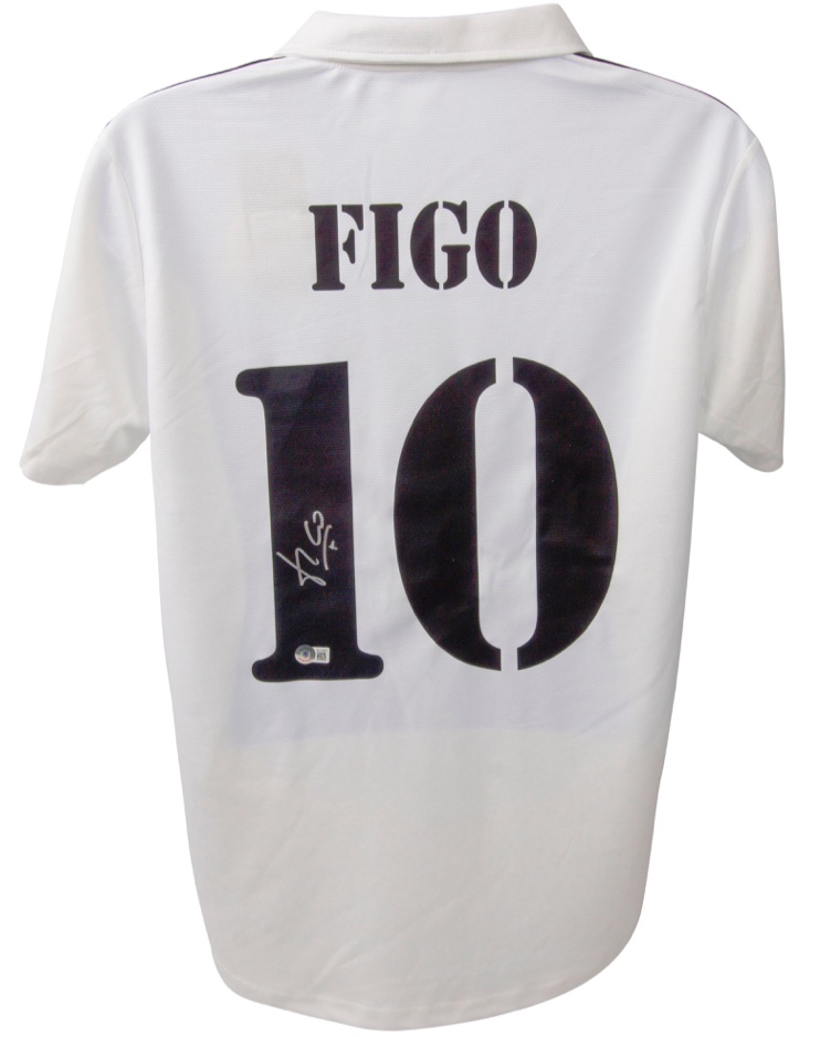 Custom on-field style jersey. Everything is printed on, size L. Hand-signed by Luis Figo.