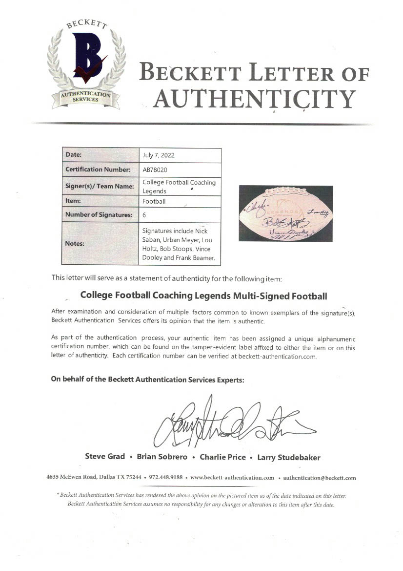 Big Game Legends of the Game Football has been hand-signed by (6) with Nick Saban, Urban Meyer, Lou Holtz, Bob Stoops, Vince Dooley and Frank Beamer.