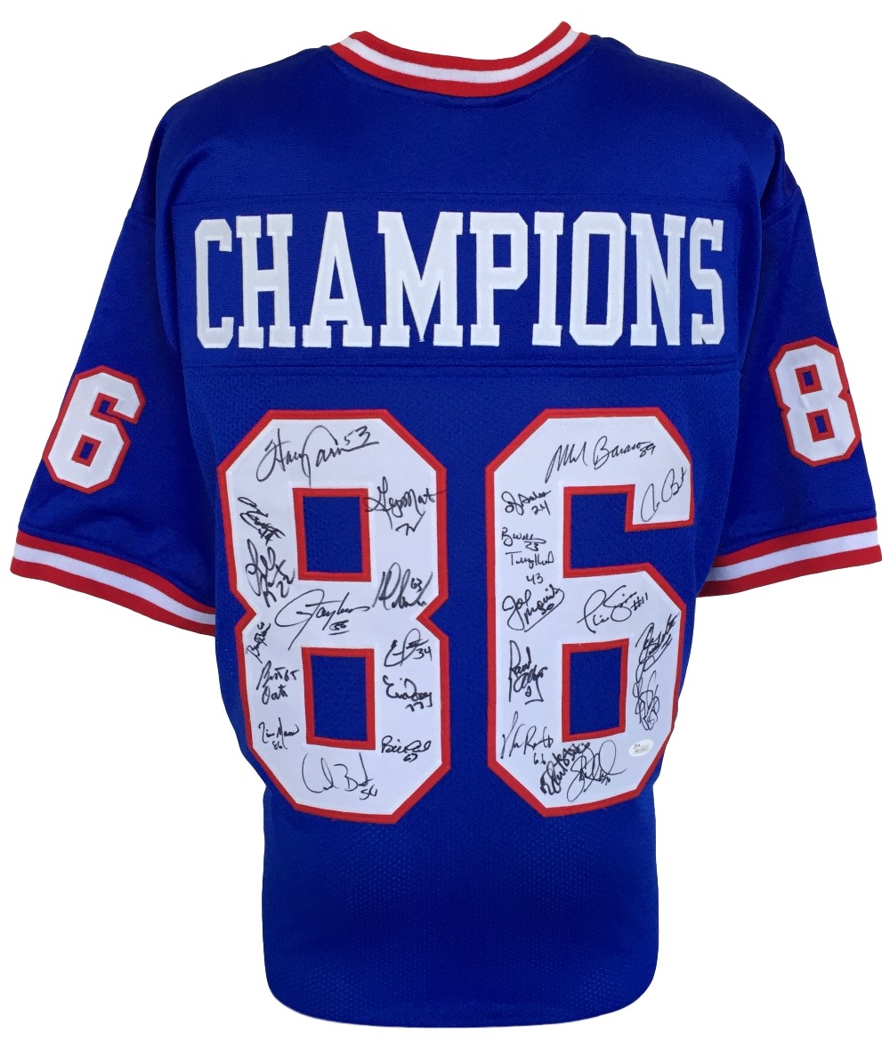 Custom on-field style jersey. Everything is sewn on, size XL. Hand-signed in black felt-tip pen by 26 members of the 1986 Super Bowl Champion New York Giants. The autographs include Raul Allegre, Ottis Anderson, Billy Ard, Carl Banks, Mark Bavaro, Brad Benson, Jim Burt, Harry Carson, Maurice Carthon, Eric Dorsey, Byron Hunt, Terry Kinard, Sean Landetta, Lionel Manuel, Leonard Marshall, George Martin, Joe Morris, Karl Nelson, Bart Oates, Elvis Patterson, Gary Reasons, William Roberts, Lee Rouson, Phil Simms, Lawrence Taylor (HOF), and Perry Williams.