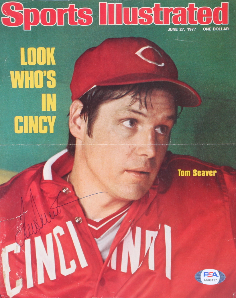 June 27, 1977 Sports Illustrated Magazine cover measures 8" x 10" in size and has been hand-signed by Tom Seaver (D. 2020, Cincinnati Reds, HOF). Please note, there are tears and creasing on the cover.