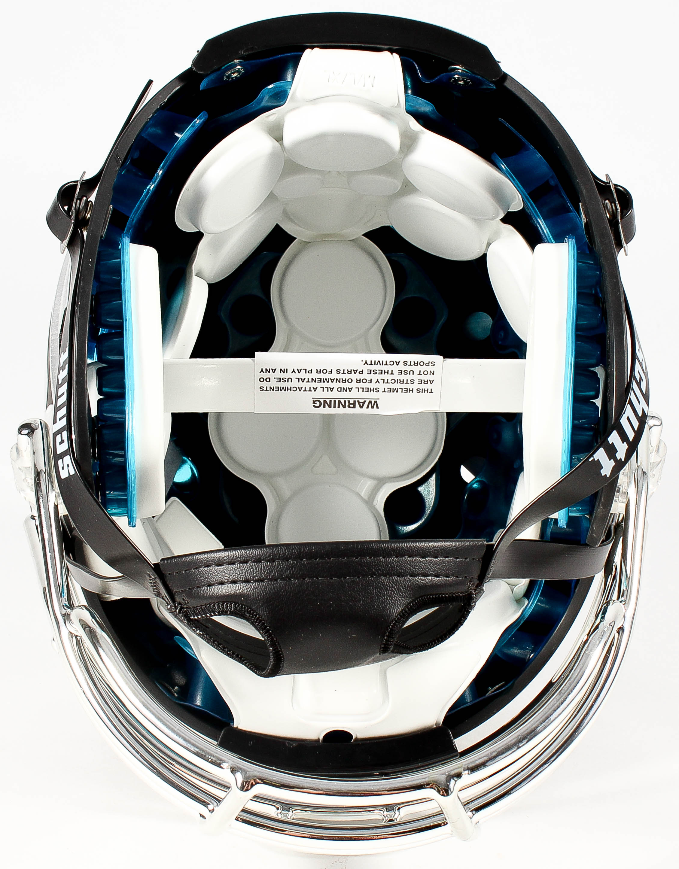 Schutt full-size authentic proline custom matte black & chrome helmet. Hand-signed and inscribed in yellow paint pen by Marcus Mariota (Titans). Helmet is limited edition and has been hand-numbered #12/14.