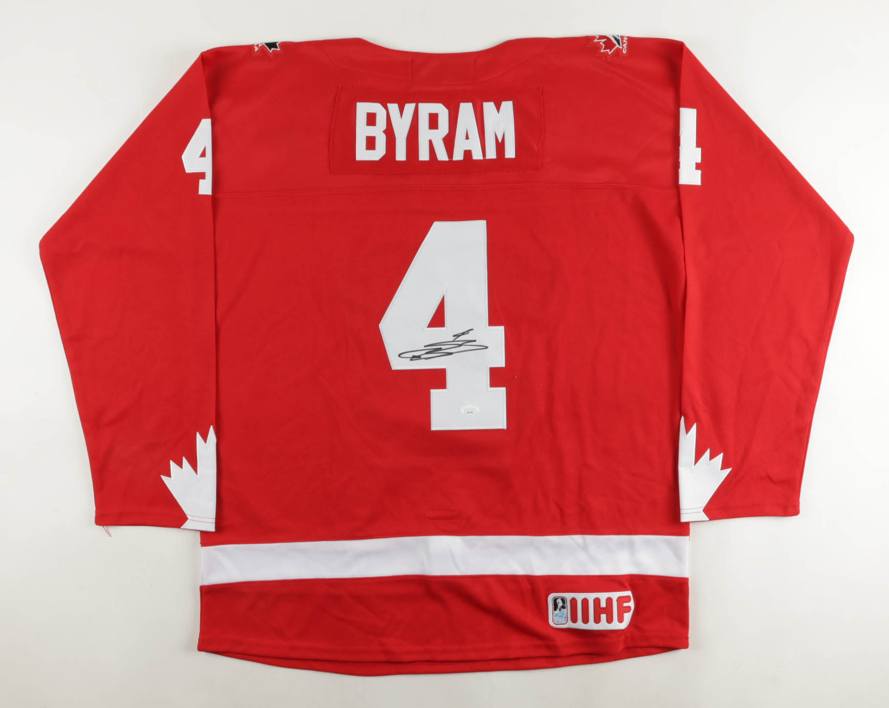 On-ice style jersey. Everything is sewn on, size (XL). Hand-signed by Bowen Byram (Colorado Avalanche).