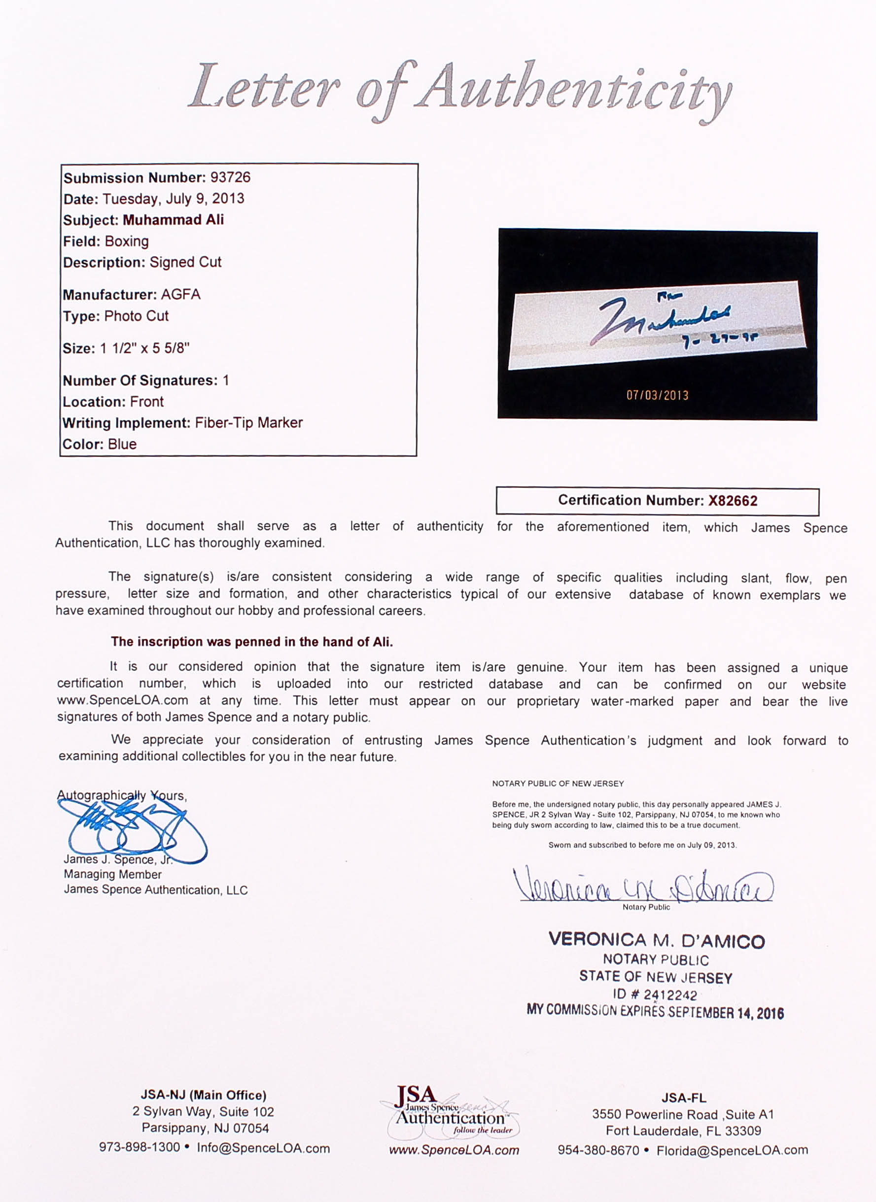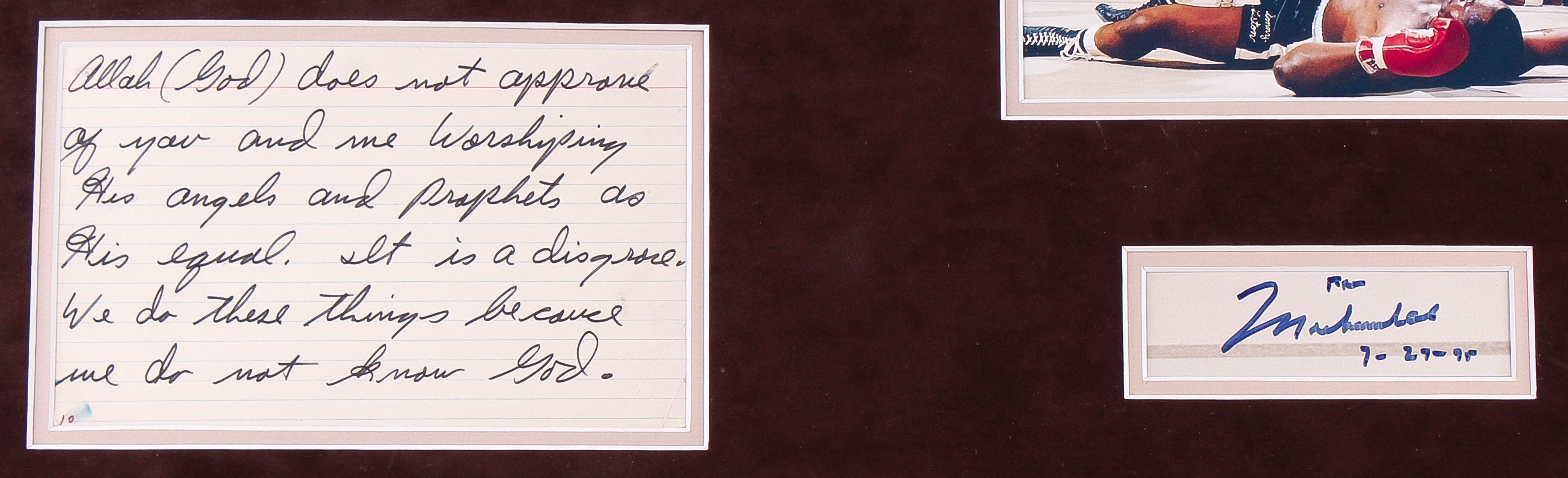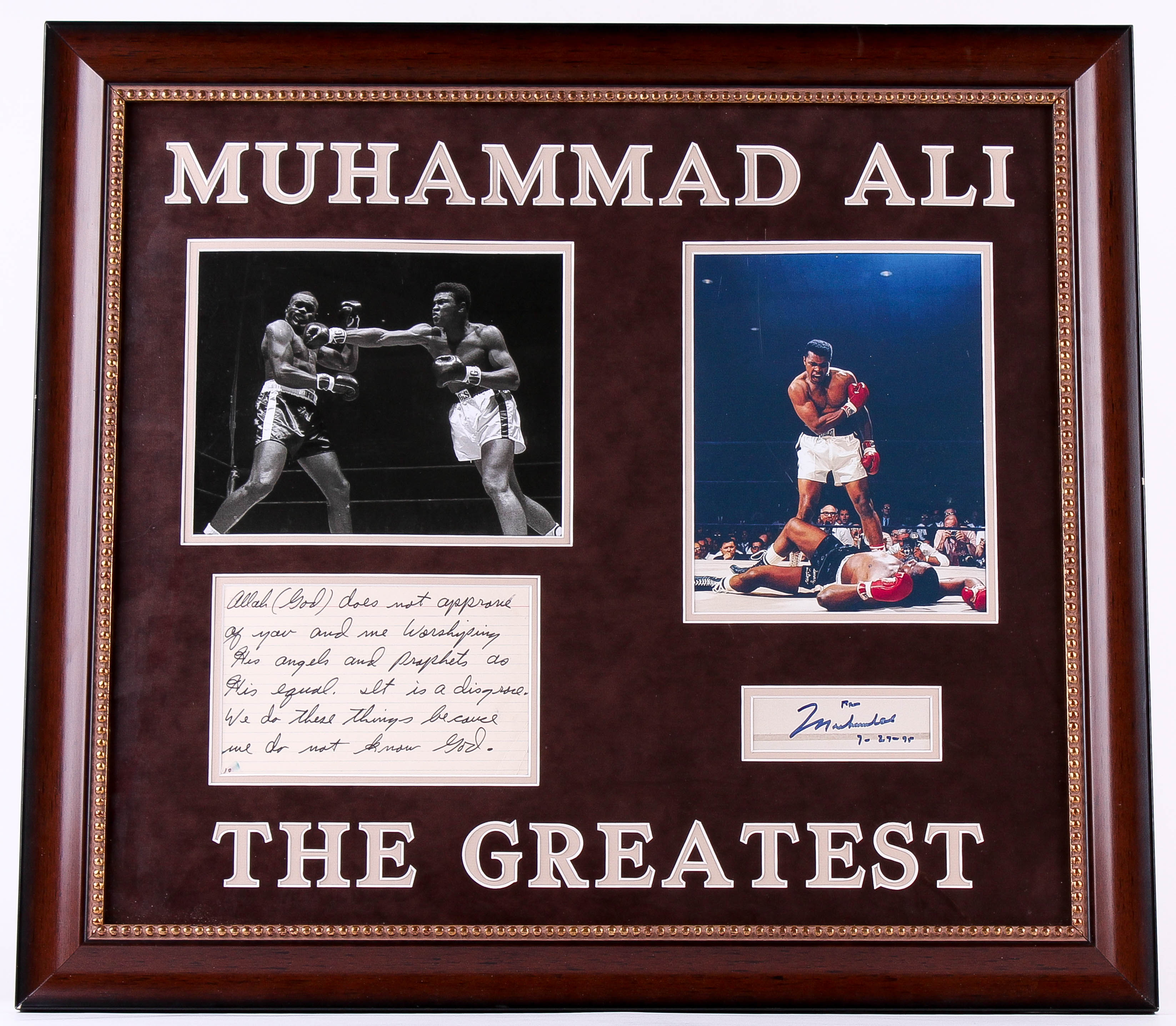 Custom framed display measures 26" x 29" in size. The frame features a cut that has been hand-signed and inscribed by Muhammad Ali (D 2016). The frame also features a hand-written letter penned by Muhammad Ali. Please see photos for more details regarding the condition of the frame.