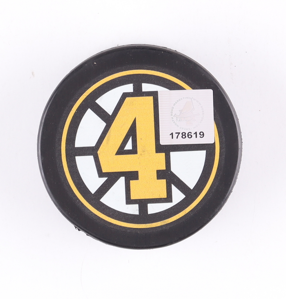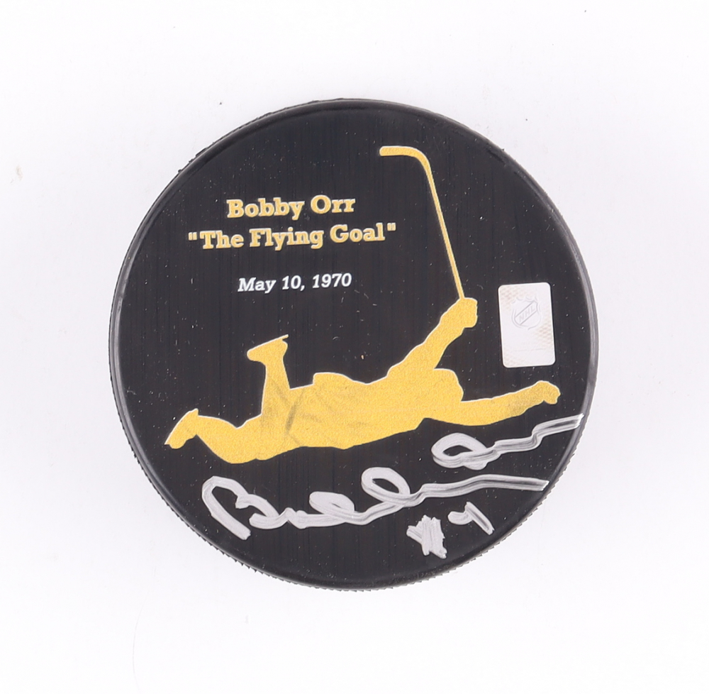 Boston Bruins logo hockey puck is hand-signed by Bobby Orr (HOF).