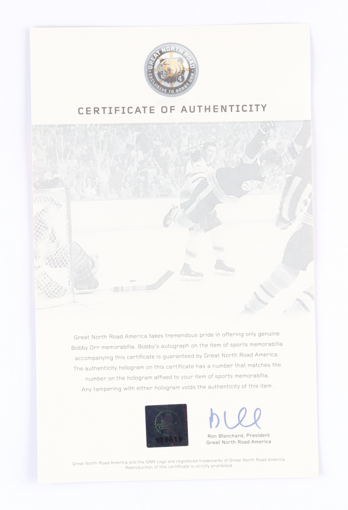 The autograph includes an official Bobby Orr hologram and matching COA from Great North Road for authenticity purposes.