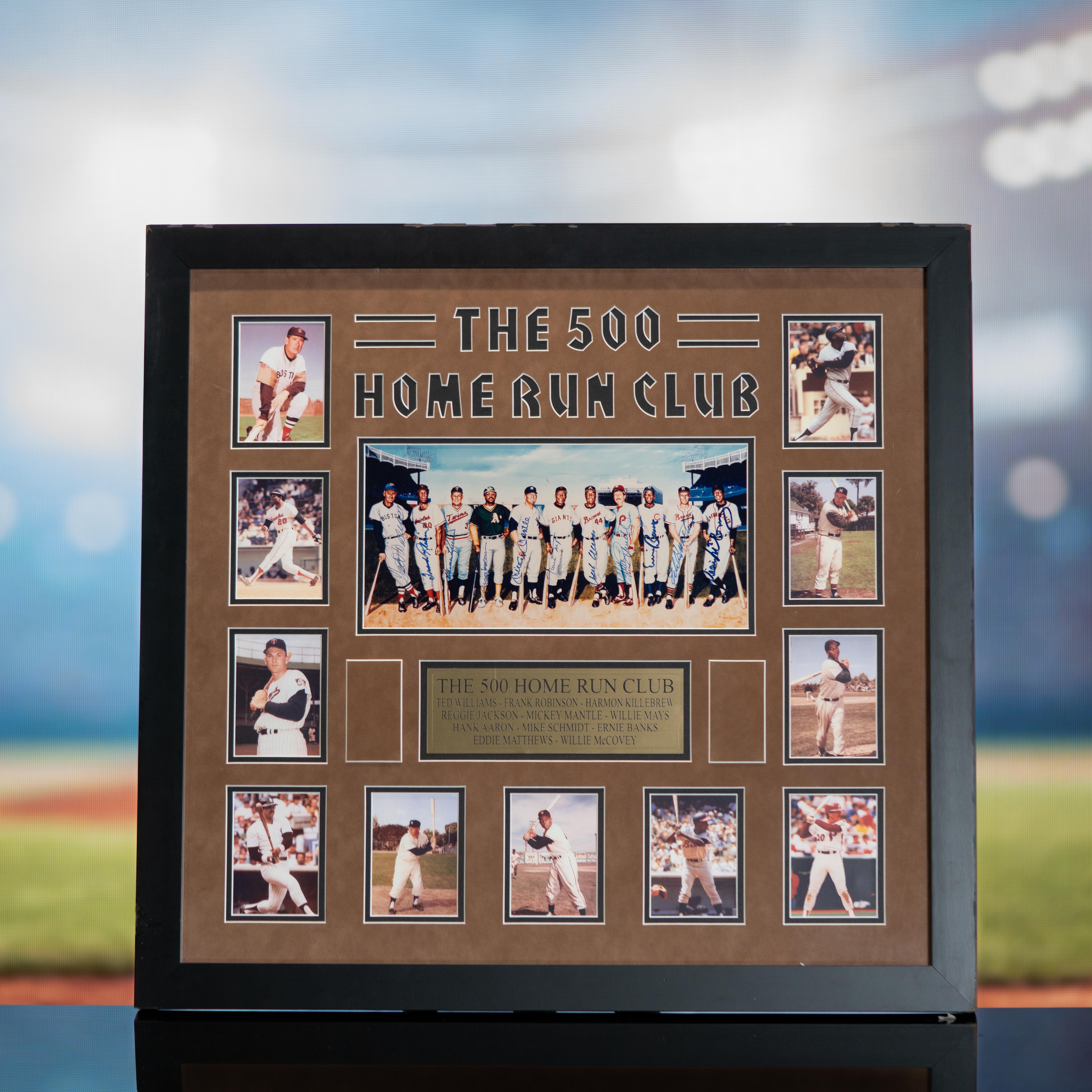 Custom frame measures approximately 28" x 30" in size and features a print that has been hand-signed by (11) members of the "500 Home Run Club," with Ted Williams (D. 2002, Boston Red Sox, HOF), Frank Robinson (D. 2019, Cincinnati Reds, HOF), Harmon Killebrew (D. 2011, Minnesota Twins, HOF), Reggie Jackson (Oakland Athletics, HOF), Mickey Mantle (D. 1995, New York Yankees, HOF), Willie Mays (San Francisco Giants, HOF), Hank Aaron (D. 2021, Atlanta Braves, HOF), Mike Schmidt (Philadelphia Phillies, HOF), Ernie Banks (D. 2015, Chicago Cubs, HOF), Eddie Mathews (D. 2001, Atlanta Braves, HOF), and Willie McCovey (D. 2018, San Francisco Giants, HOF).