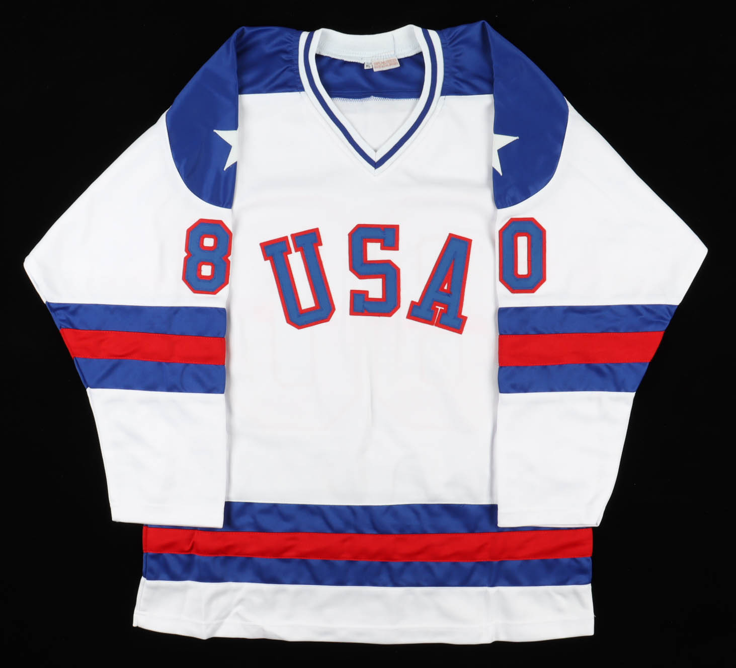 Custom on-ice style jersey. Everything sewn on, size XL. Hand-signed by (17) including Mike Eruzione, Jim Craig, Steve Janaszak, Dave Christian, Ken Morrow, Jack O'Callahan, Mike Ramsey, Rob McClanahan, Buzz Schneider, Dave Silk, Phil Verchota, Neal Broten, Mark Johnson, Mark Wells, Craig Patrick, John Harrington, and Eric Strobel.