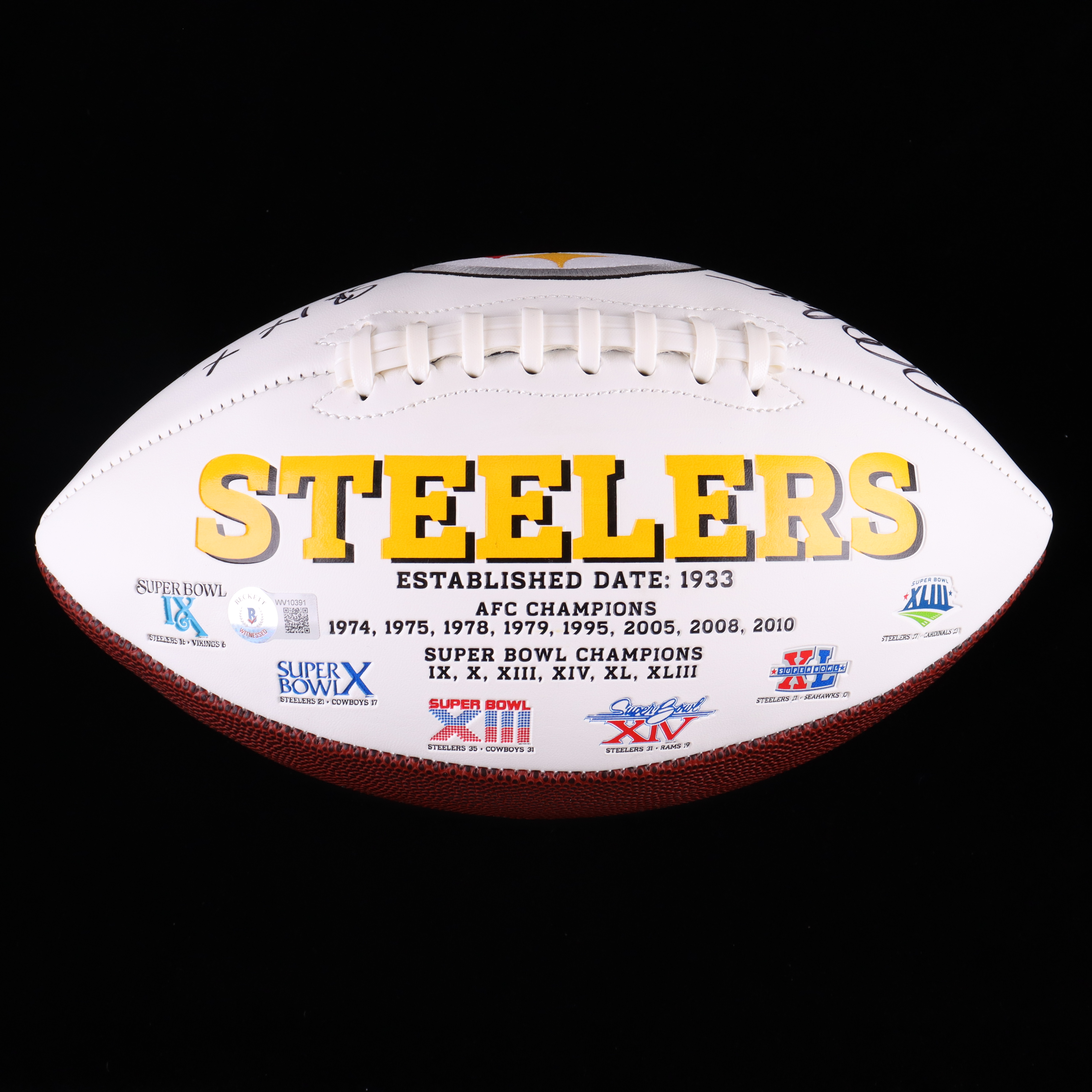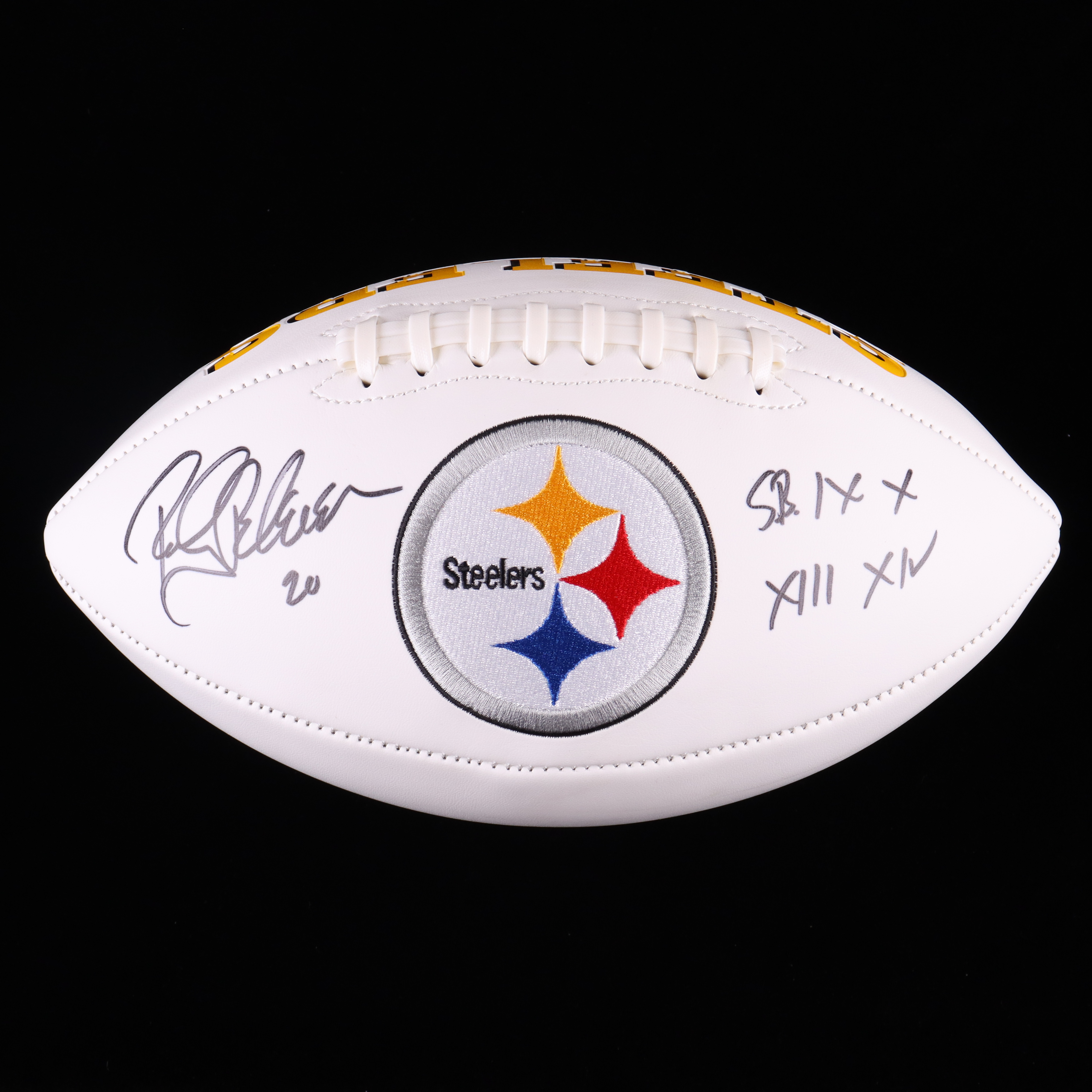 Pittsburgh Steelers logo football. Hand-signed and inscribed by Rocky Bleier.