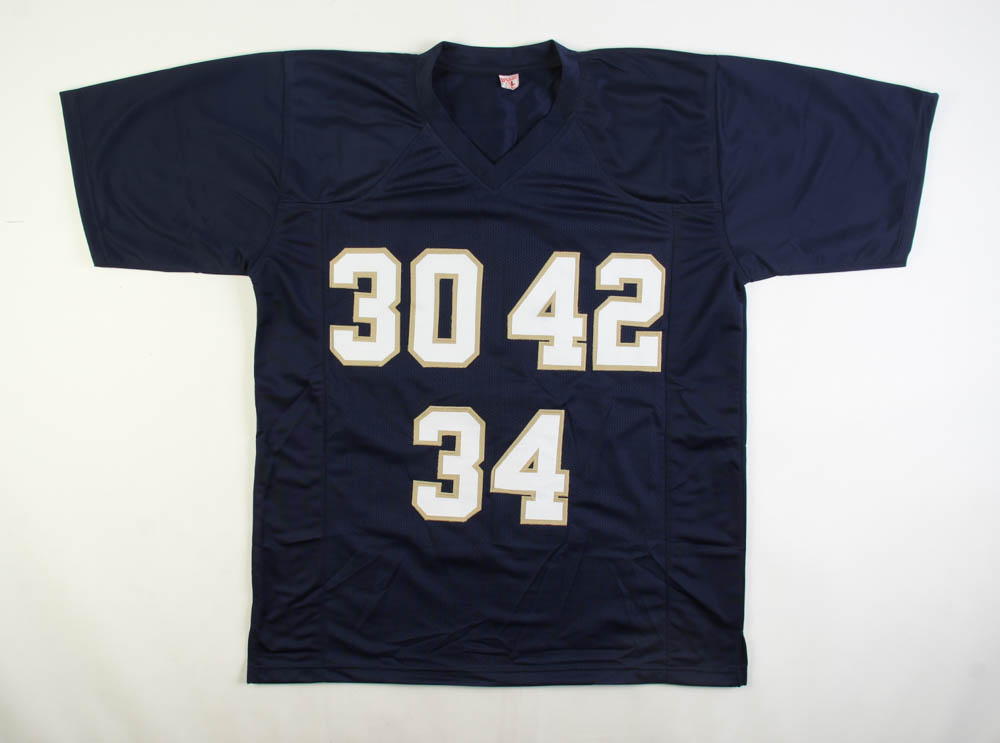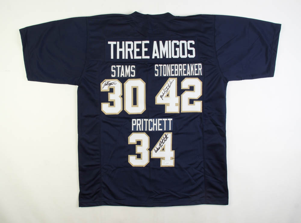 Custom on-field style jersey. Everything sewn on, size XL. Hand-signed by Frank Stams, Michael Stonebreaker and Wes Pritchett.