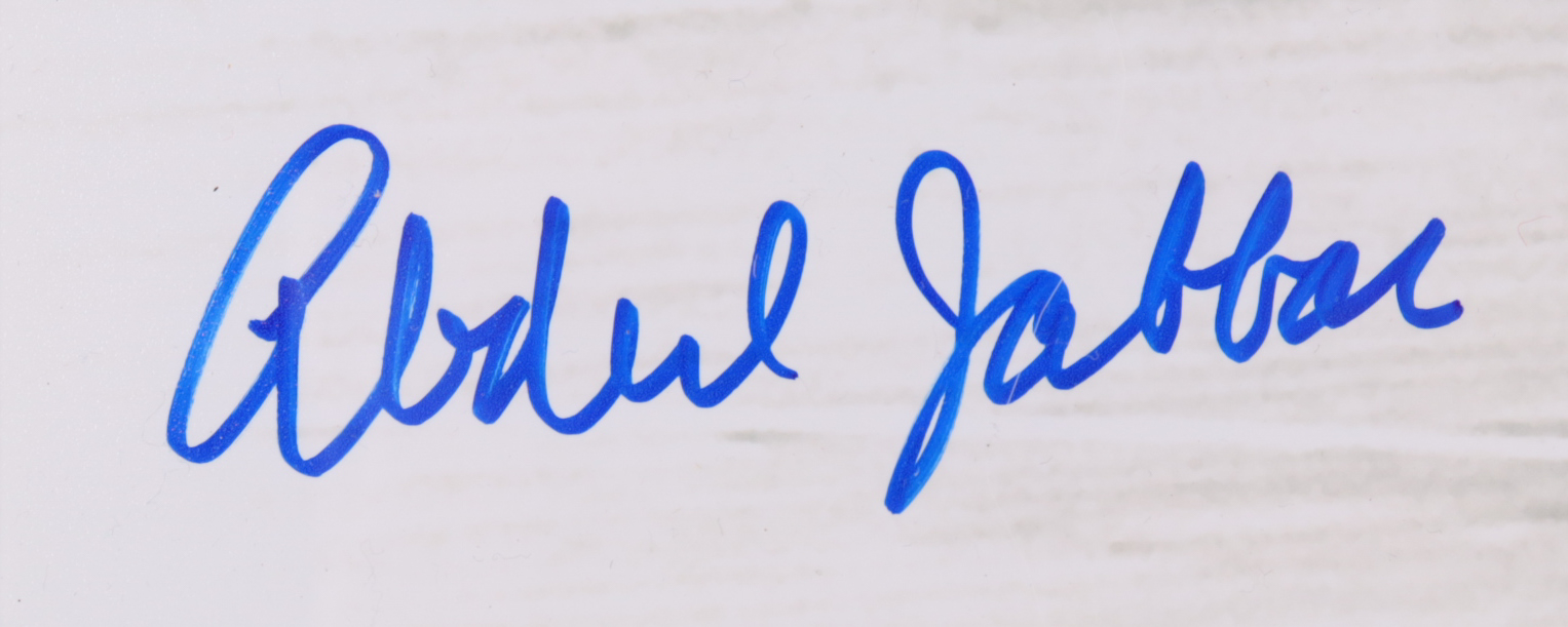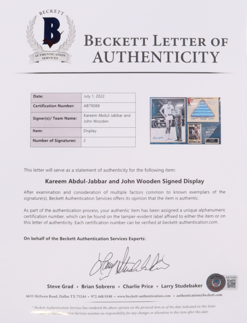 Custom frame measures approximately 22" x 28" in size and features a photo that has been hand-signed by Kareem Abdul-Jabbar (HOF) and John Wooden (D. 2010, HOF).