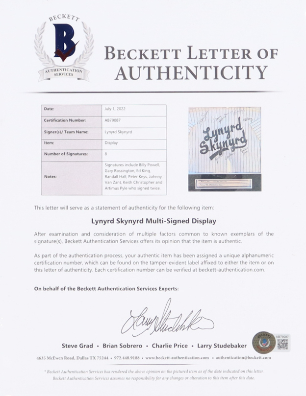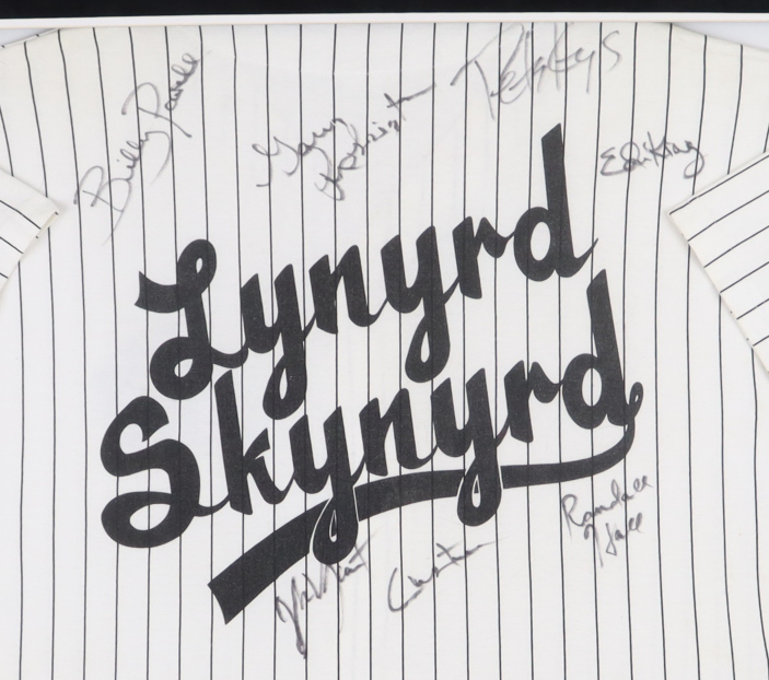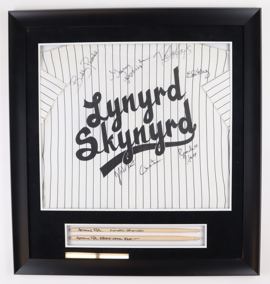 Custom frame measures approximately 31" x 33" in size and features a jersey and pair of drumsticks that have been hand-signed and inscribed by (8) band members of Lynyrd Skynyrd (HOF), with Artimus Pyle, Billy Powell, Gary Rossington, Ed King, Randall Hall, Peter Keys, Johnny Van Zant, and Keith Christoper.