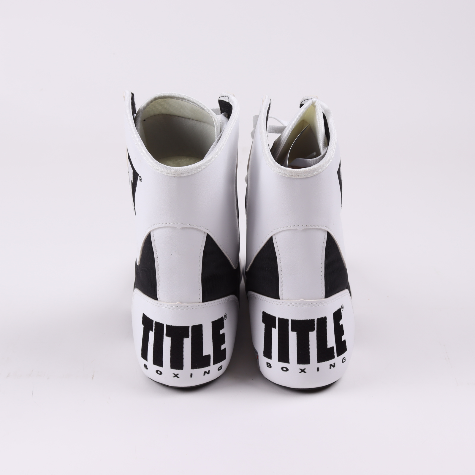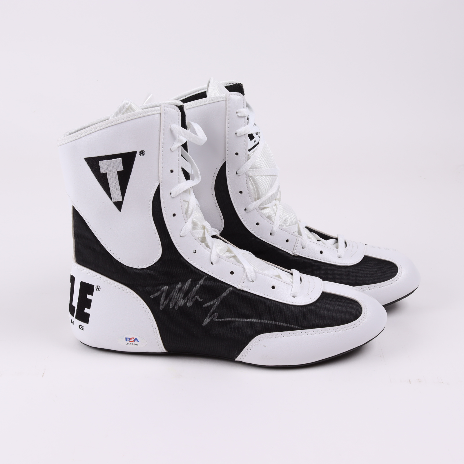 Pair of (2) Title Boxing boots, size 9. The left-footed boot has been hand-signed by Mike Tyson (HOF). Please note, the signature is lightly faded.