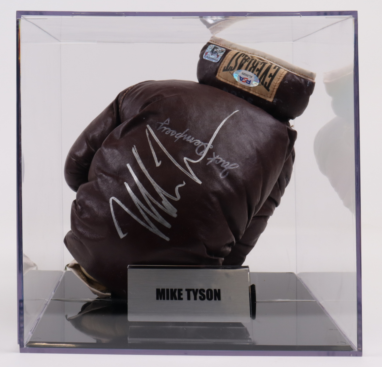 Pair of (2) Everlast boxing gloves. The left glove has been hand-signed by Mike Tyson (HOF). Includes display case as shown.