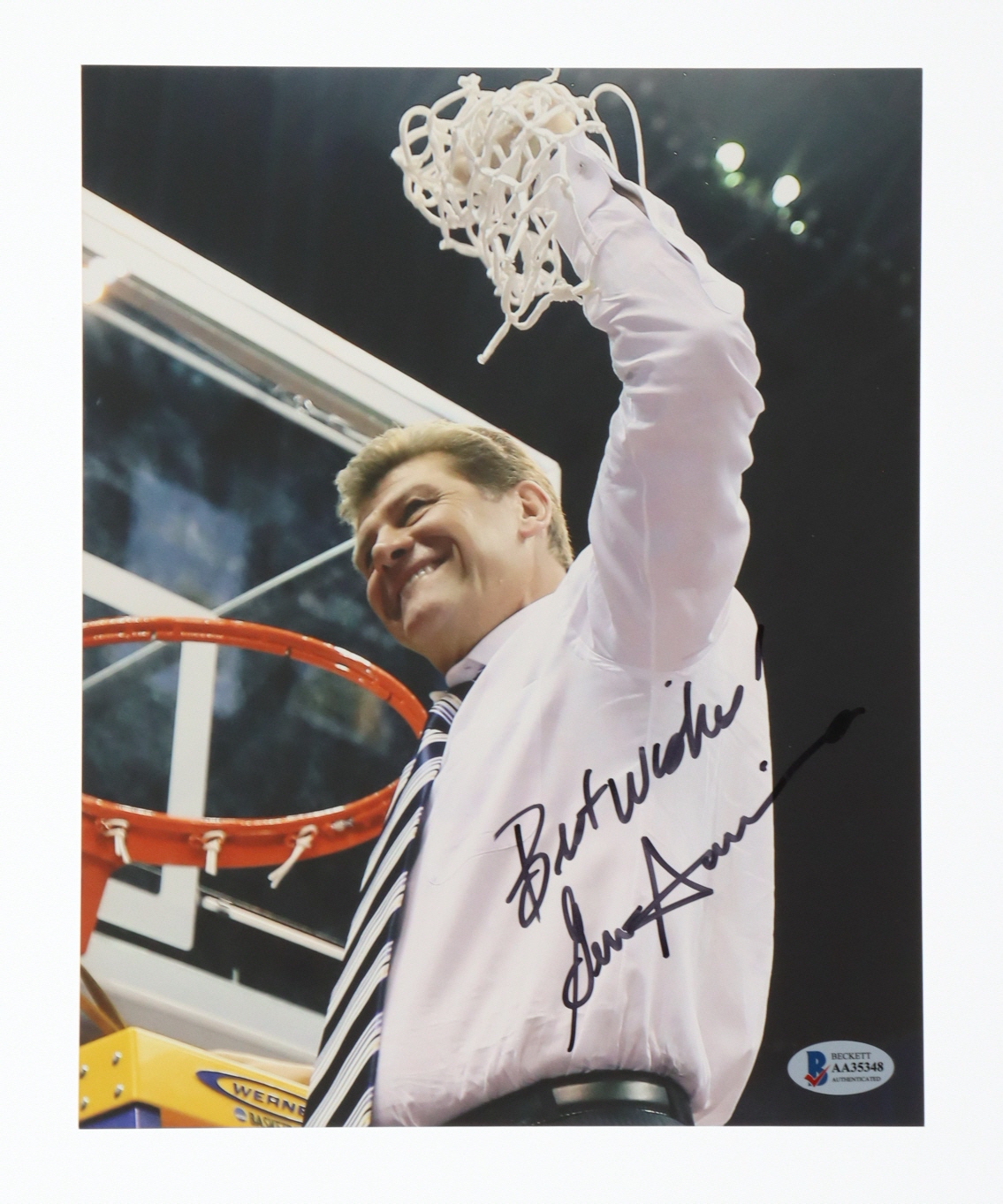 Photo measures 8" x 10" in size. Hand-signed and inscribed by Geno Auriemma (UConn Huskies, HOF).