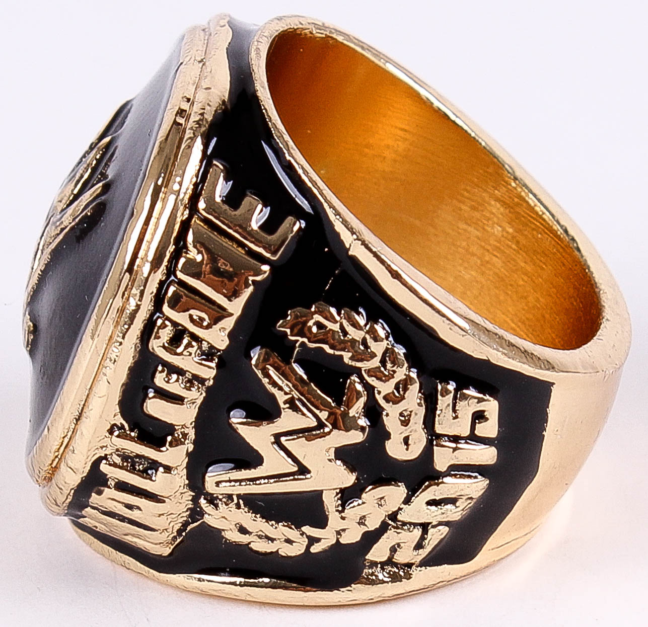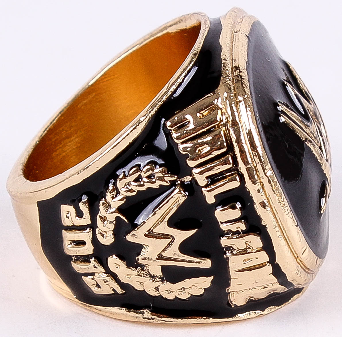 WWE 2015 High Quality Replica Hall of Fame Ring. The ring has been hand crafted by professional jewelers. Made of metal alloy and clad with gold. Size 11.5.
