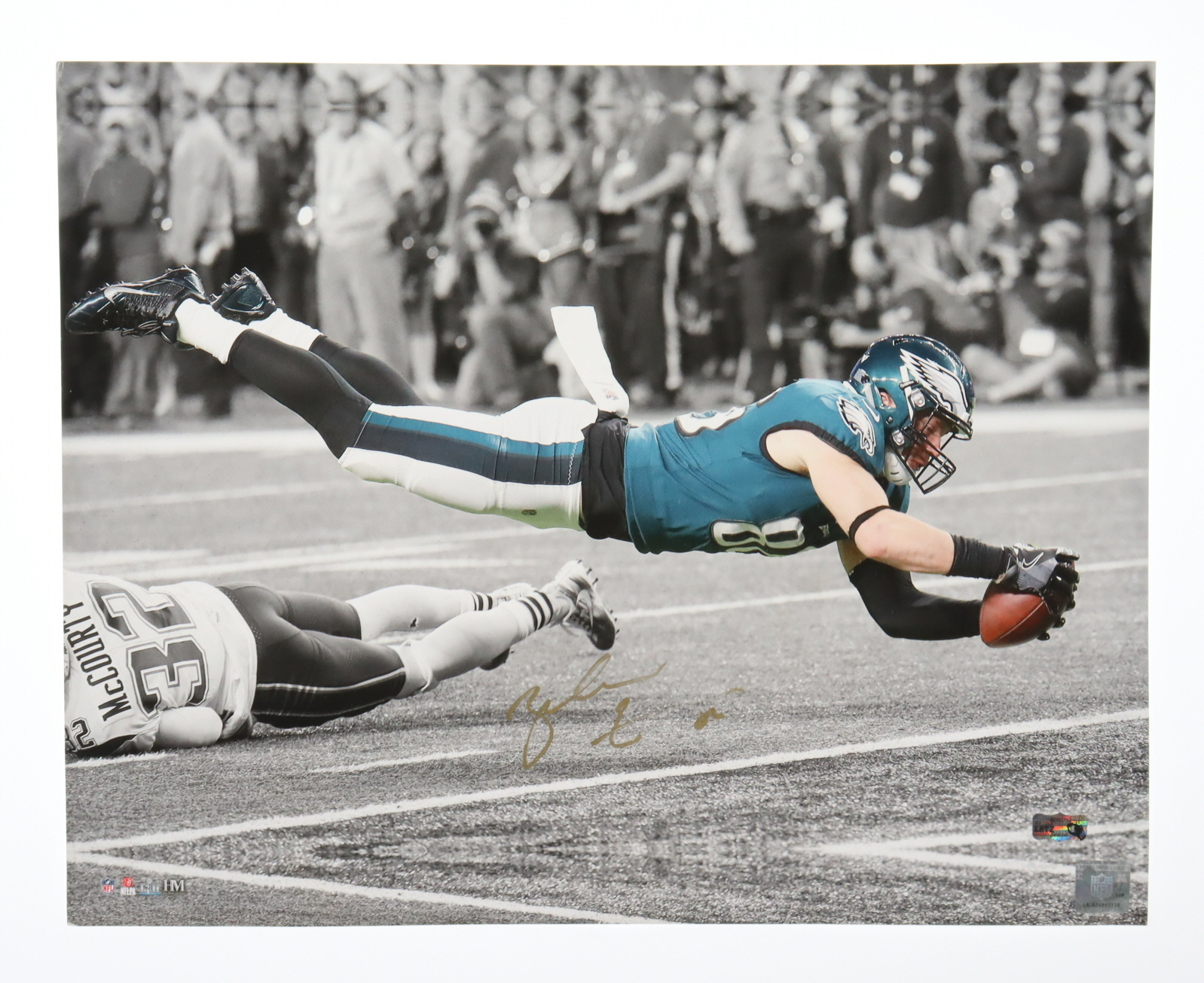Photo measures 16" x 20" in size and has been hand-signed by Zach Ertz (Philadelphia Eagles). Please note, there is overall warping of the photo.