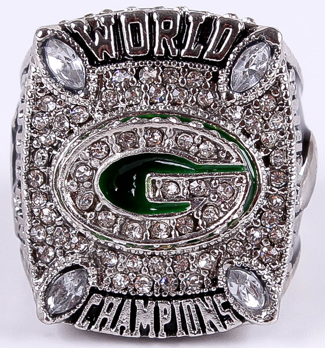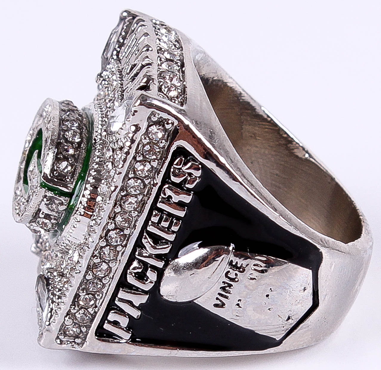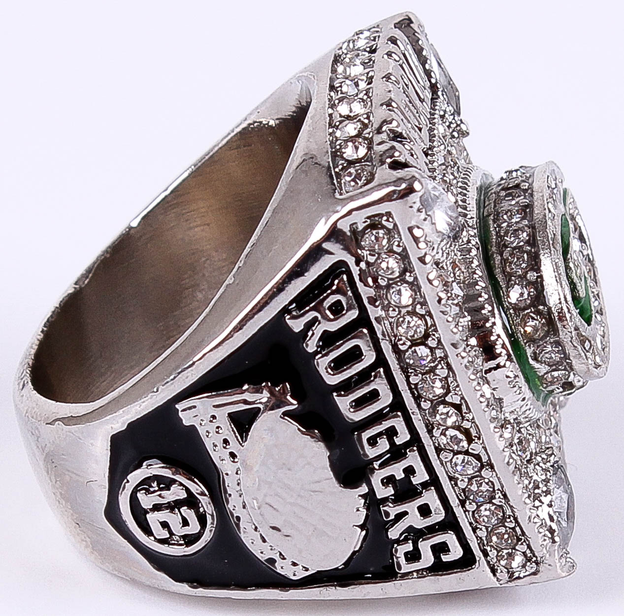Aaron Rodgers Packers High Quality Replica 2010 Super Bowl XLV Championship Ring. The ring has been hand crafted by professional jewelers. Made of metal alloy and clad with Silver. Size 12.5.