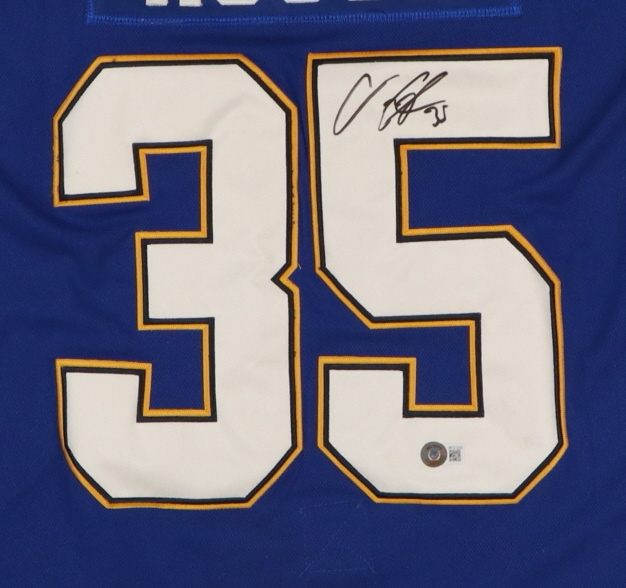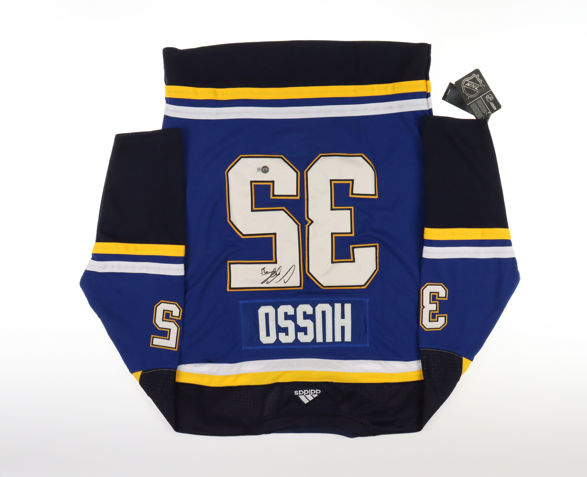 Adidas on-ice style jersey. Everything sewn on, size 52. Hand-signed by Ville Husso (St. Louis Blues).