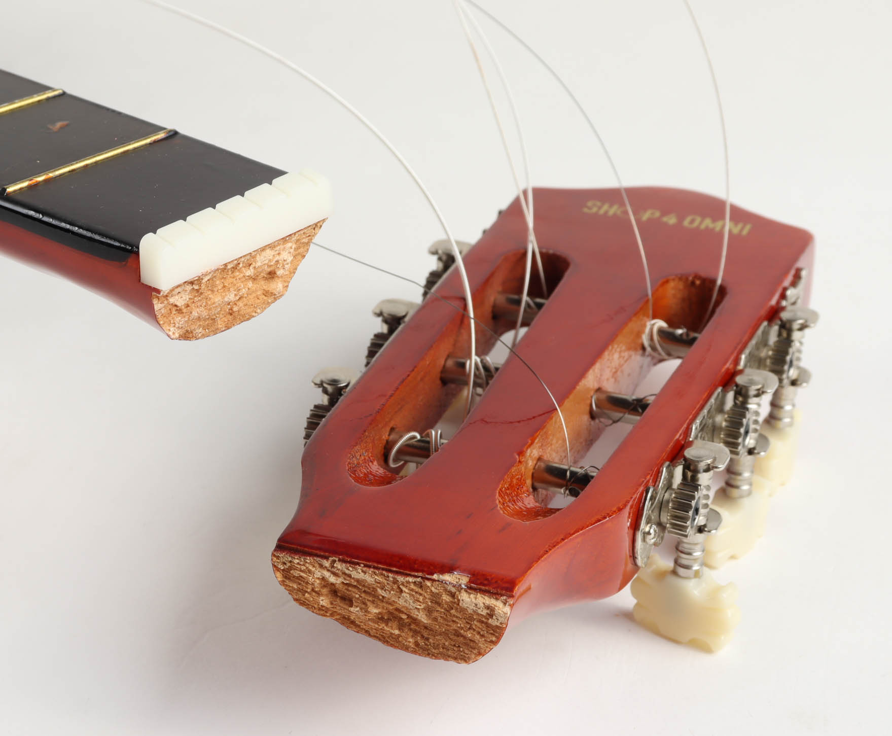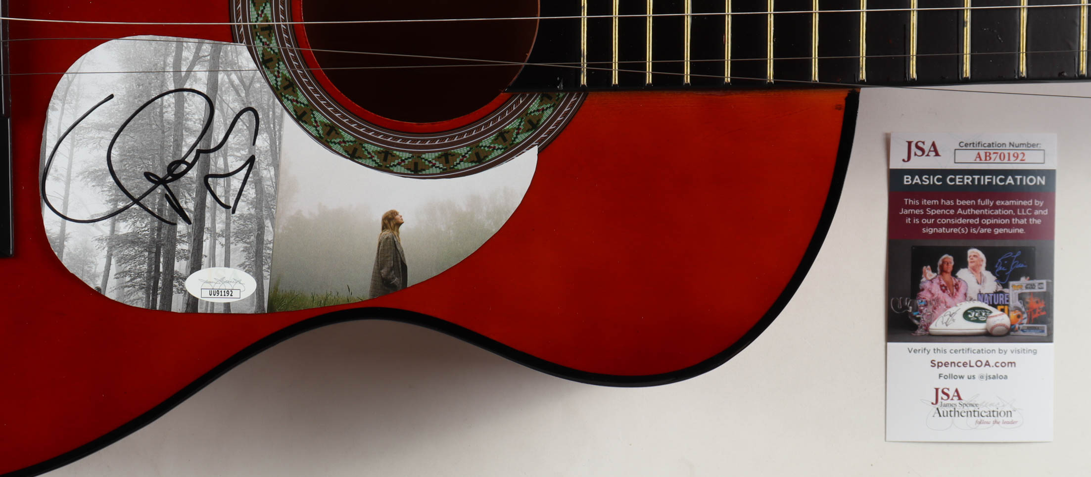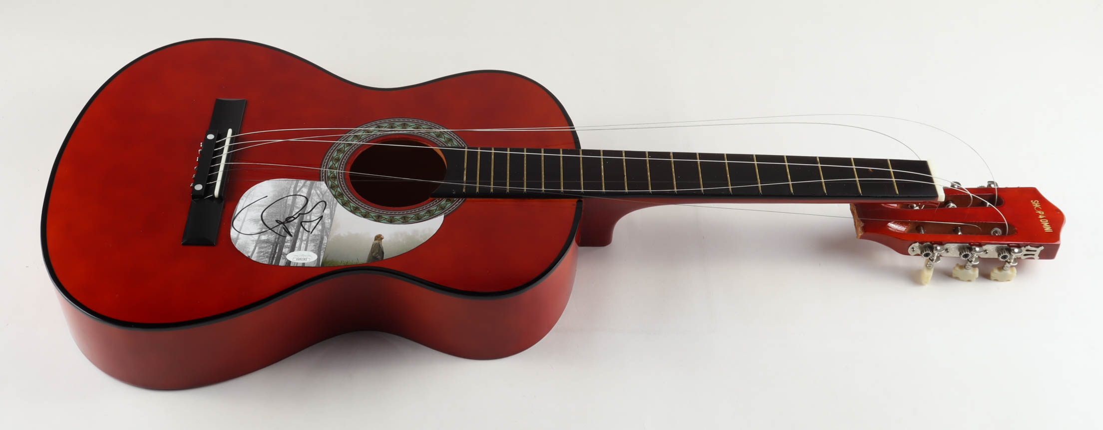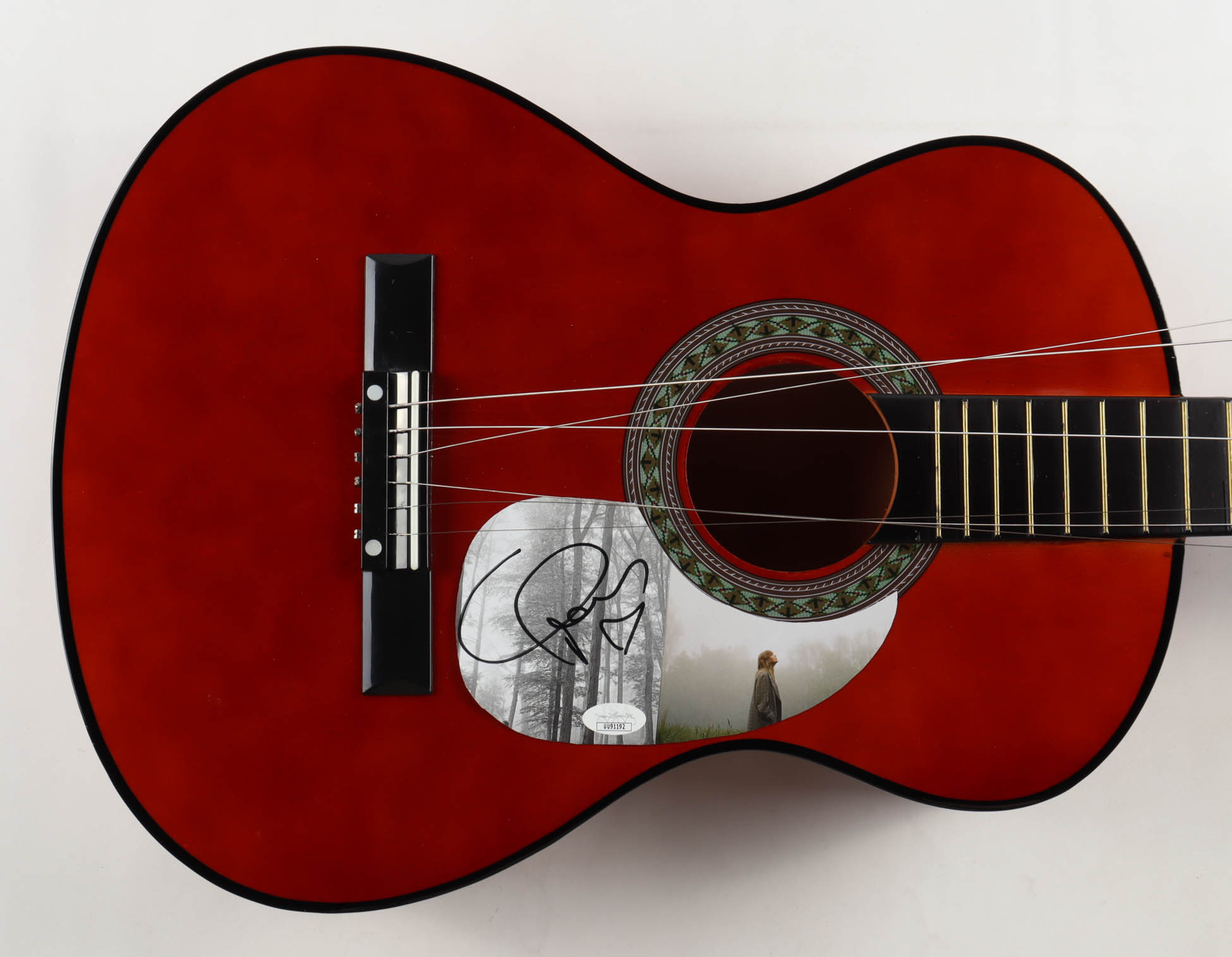 Acoustic guitar measures approximately 38" in length and has been hand-signed on a CD cover that has been repurposed as a pick-guard by Taylor Swift. This guitar is a display guitar. It is a lower-tier version and is not the same quality as one that a musician would play. Please note, that guitar is broken at the top.