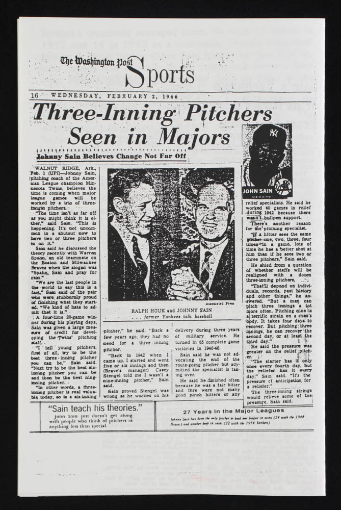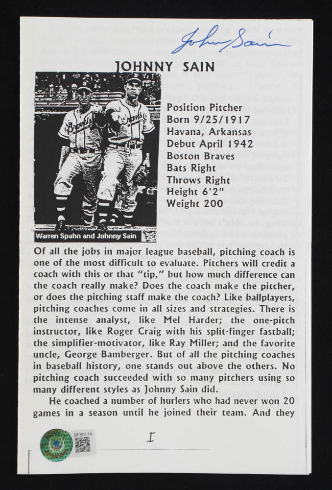 Pamphlet measures 5.5" x 8.5" in size and has been hand-signed by Johnny Sain (D. 2006, Boston Braves).