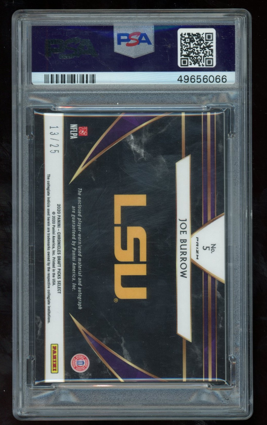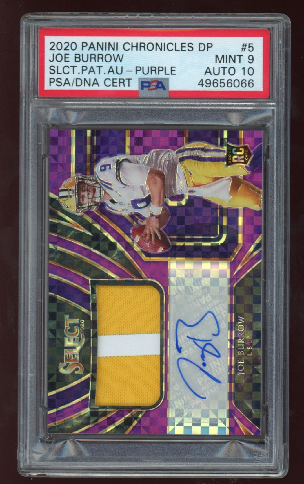 Joe Burrow 2020 Select Draft Picks Patch Autographs Purple #5 RC #13/25 (PSA 9)