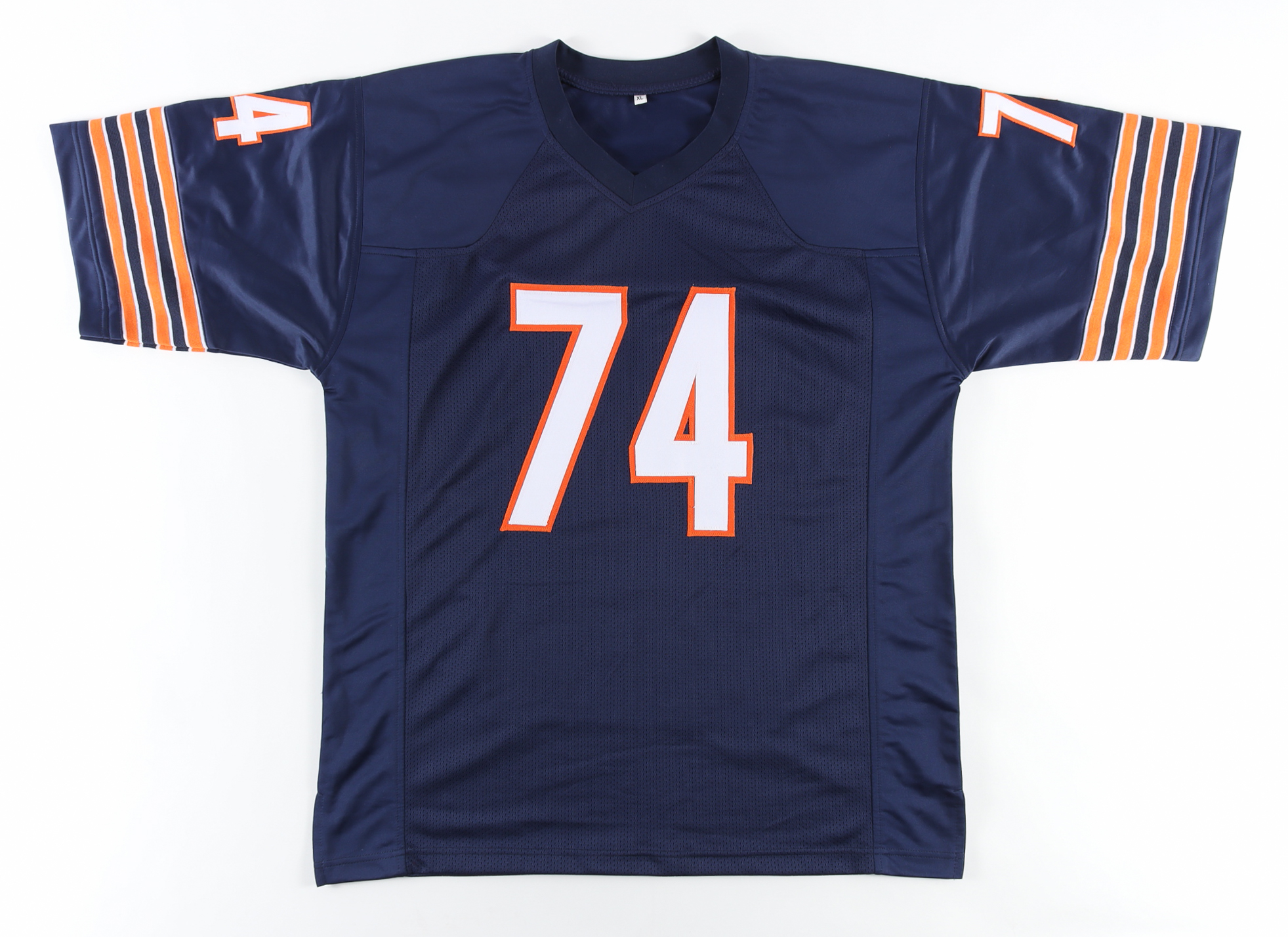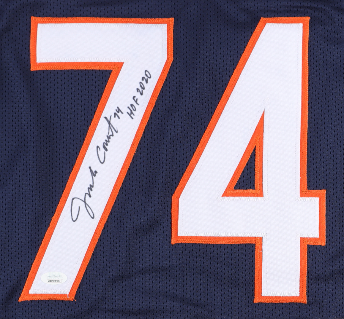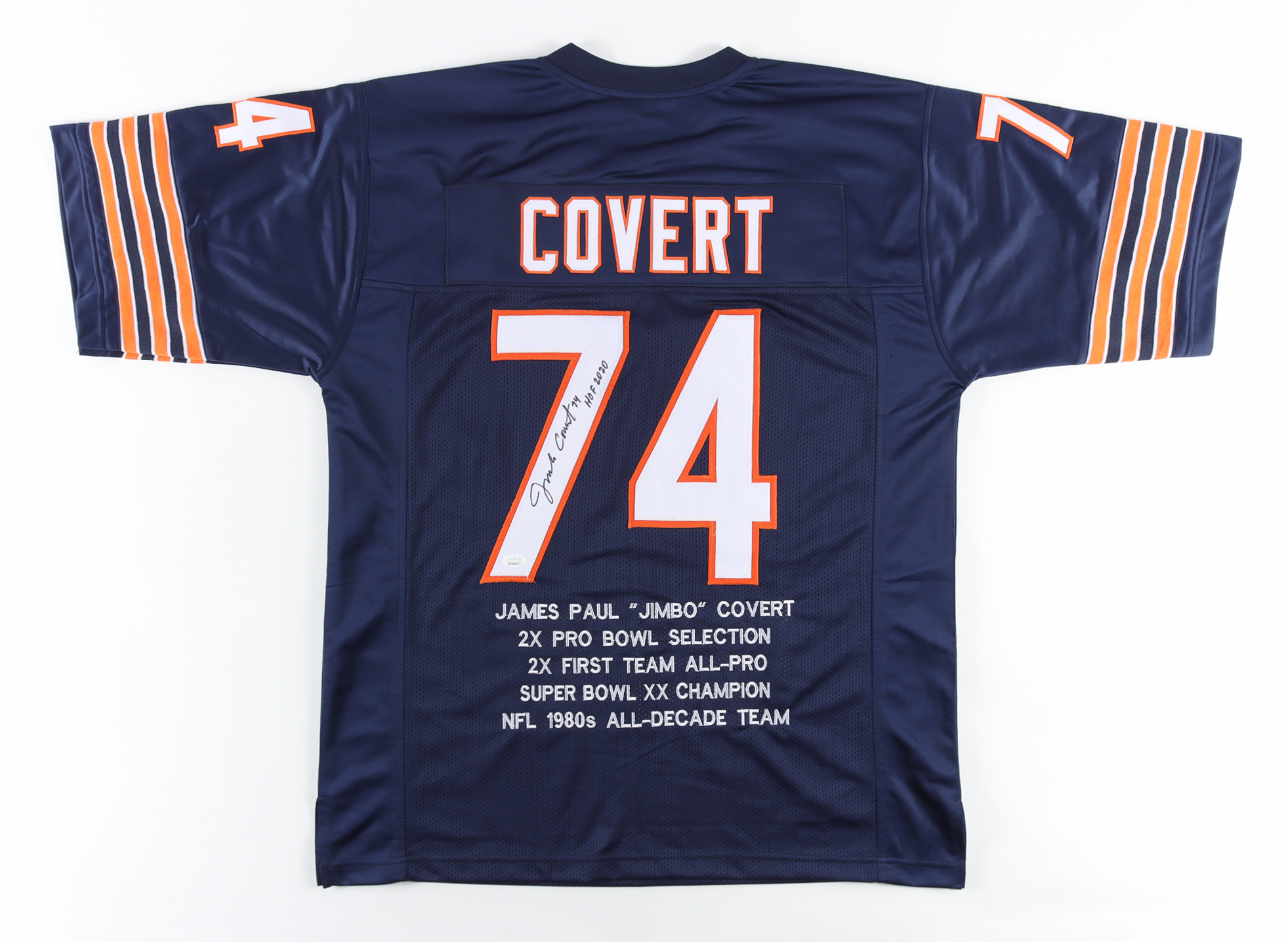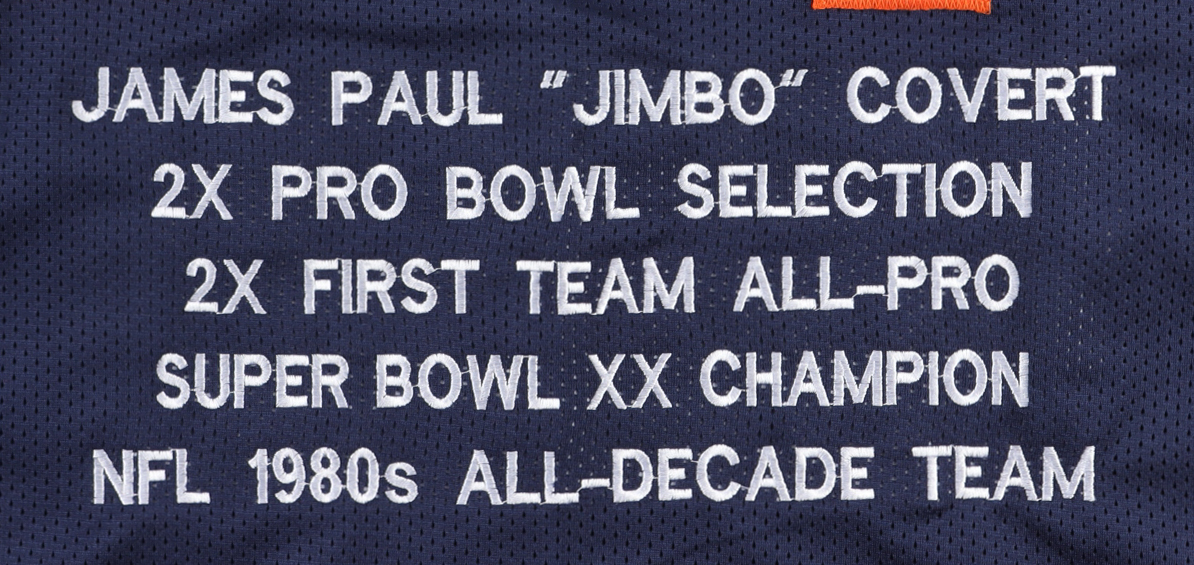 Custom on-field style jersey. Everything is sewn on, size XL. Has been hand-signed and inscribed by Jim Covert (HOF). Covert's career highlights have been custom stitched onto the back of the jersey below the reverse numbers.