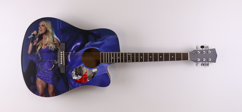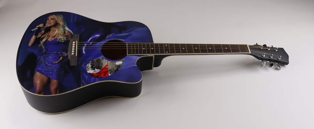 Custom acoustic guitar measures approximately 39" in length and has been hand-signed on the pickguard by Carrie Underwood.