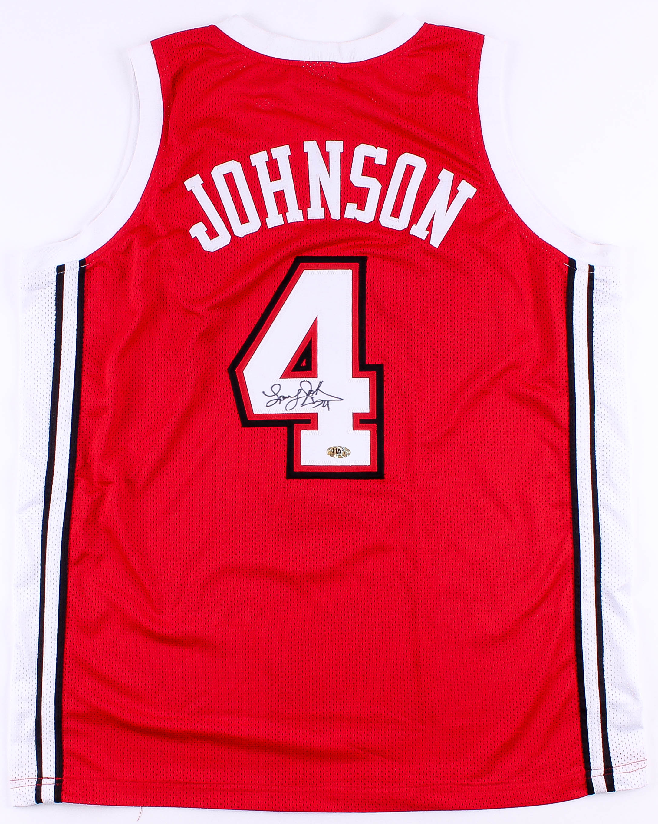 Custom on-court style jersey. Everything sewn on, size XL. Hand-signed in black felt tip pen by Larry Johnson (Knicks, Hornets)