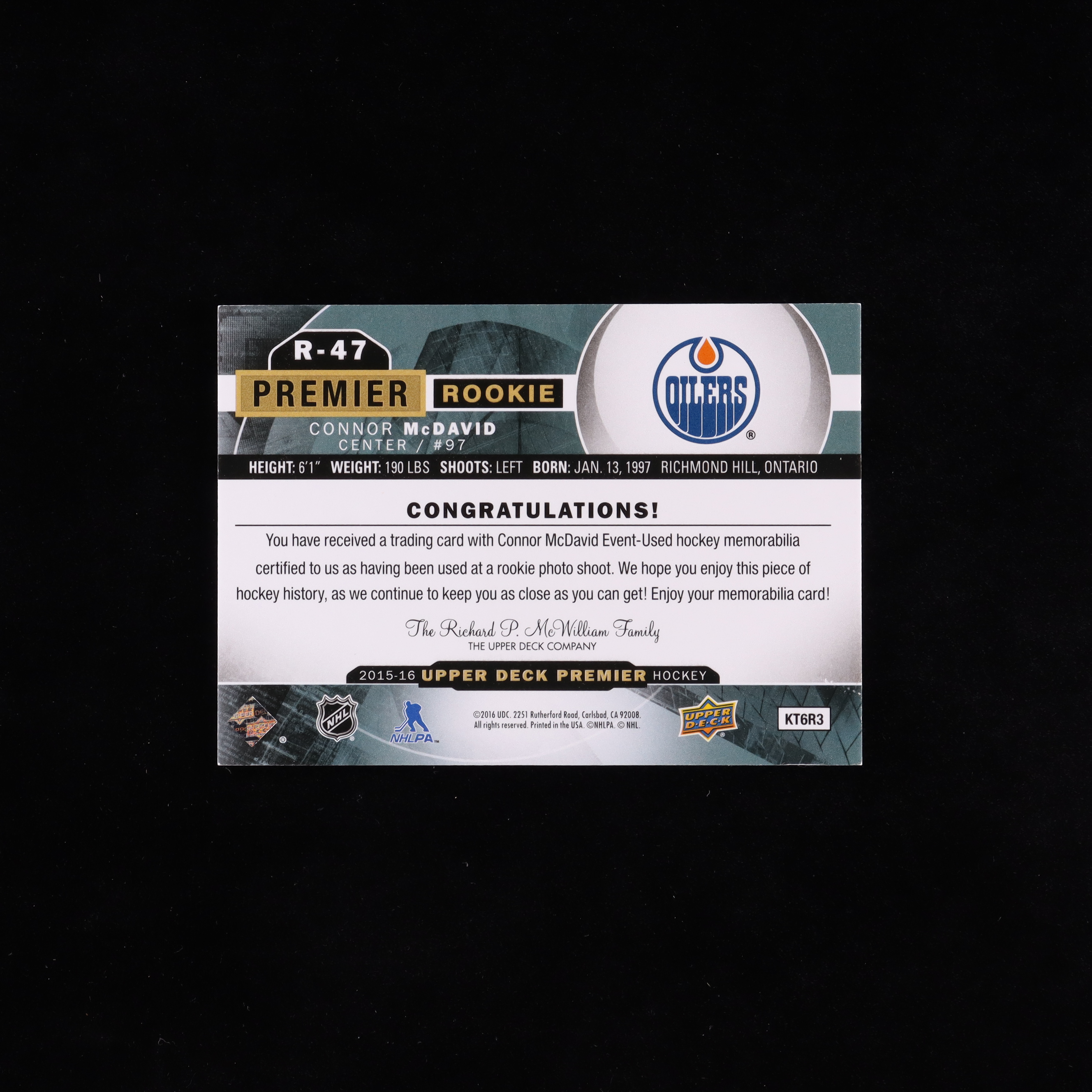 Connor McDavid 2015-16 Upper Deck Premier Rookies Jerseys #R47 RC