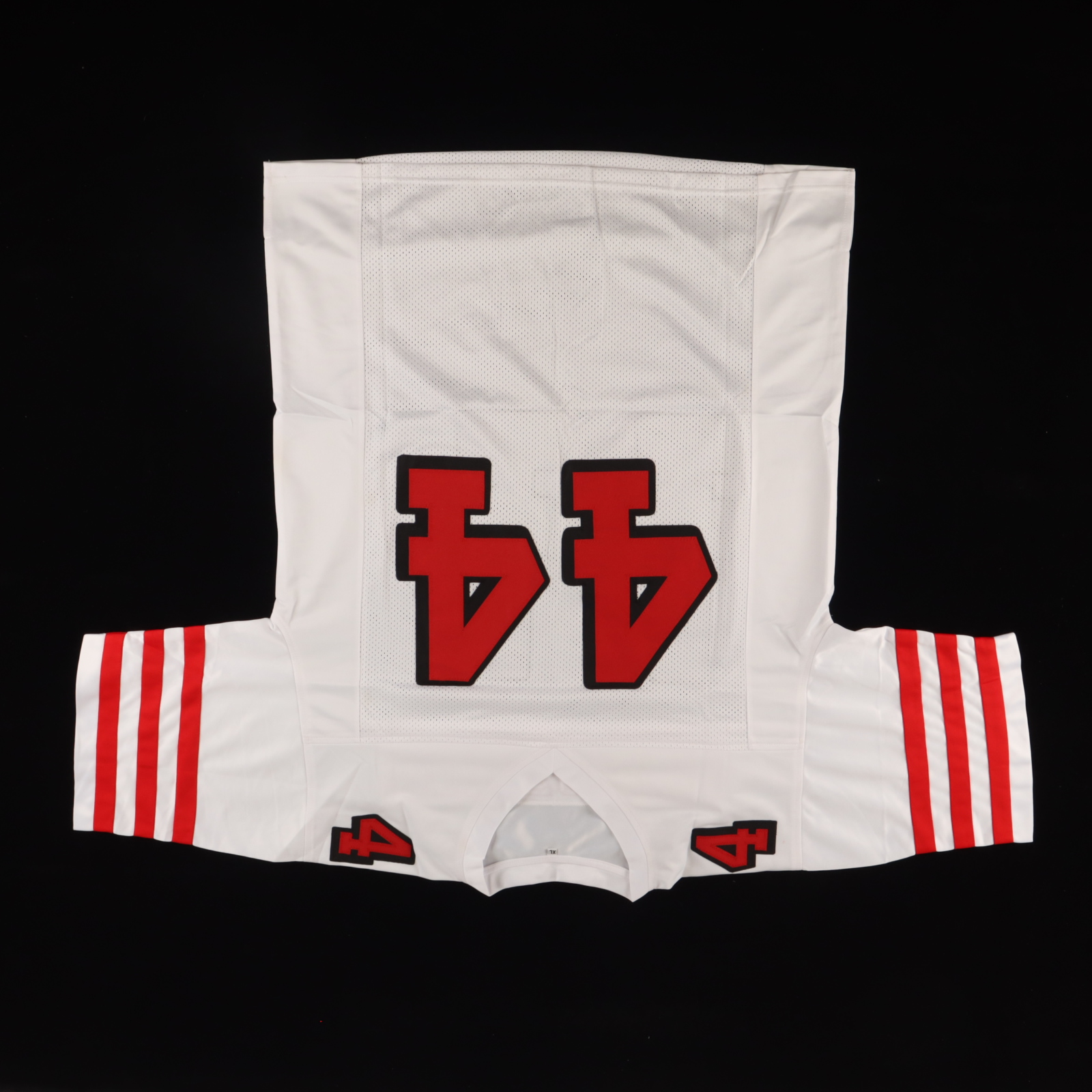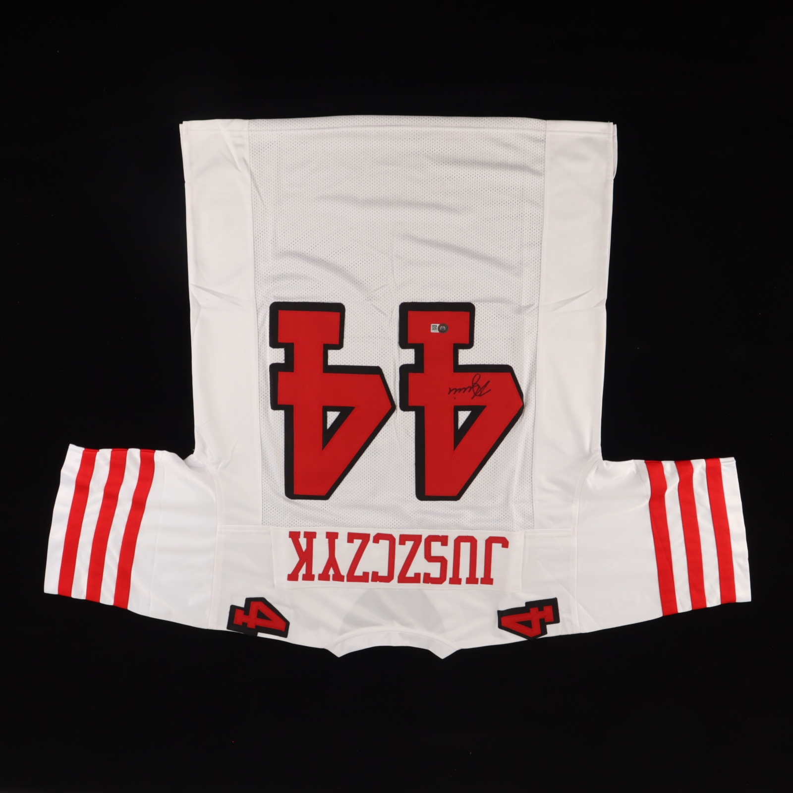 Custom on-field style jersey. Everything sewn on, size XL. Hand-signed by Kyle Juszczyk.