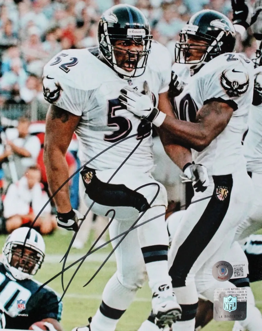 Photo measures 8" x 10" in size. Hand-signed by Ray Lewis (Baltimore Ravens, HOF).
