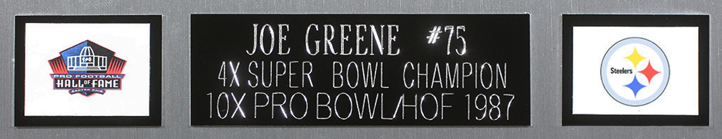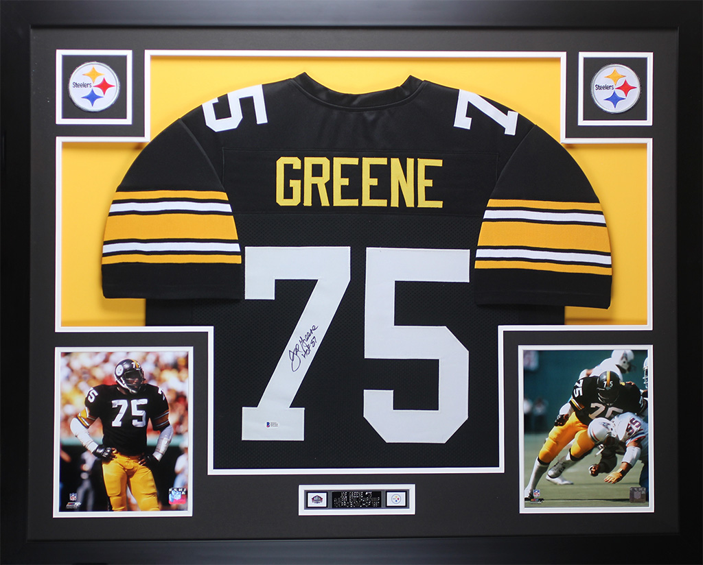 Custom frame measures approximately 35" x 43" in size and features a jersey hand-signed and inscribed by Joe Greene (HOF).