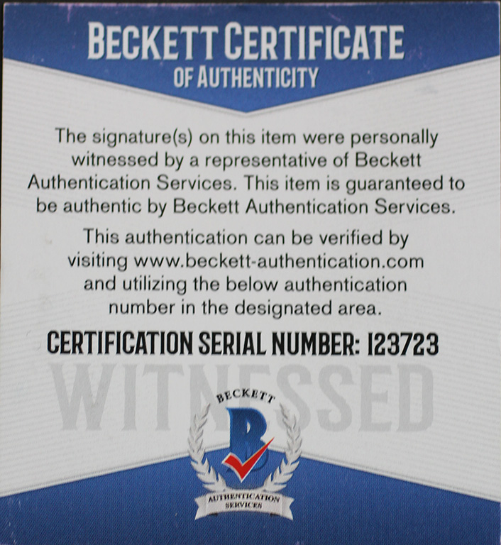 The lot / autograph(s) includes an official Beckett Authentication Services serially-numbered hologram and matching COA for authenticity purposes. The signing of this item was witnessed by Beckett.