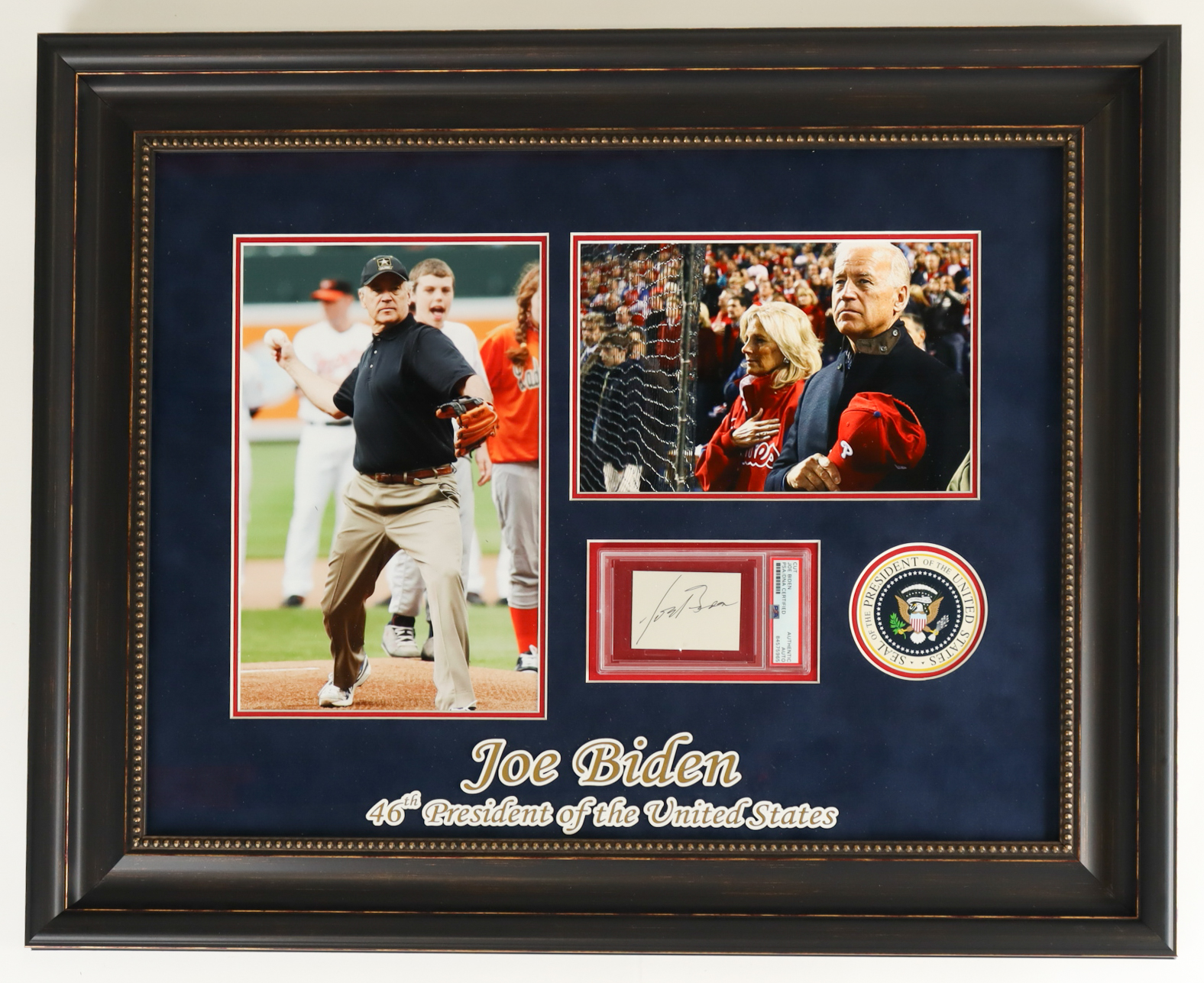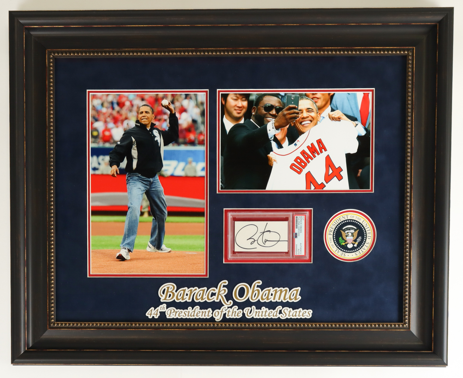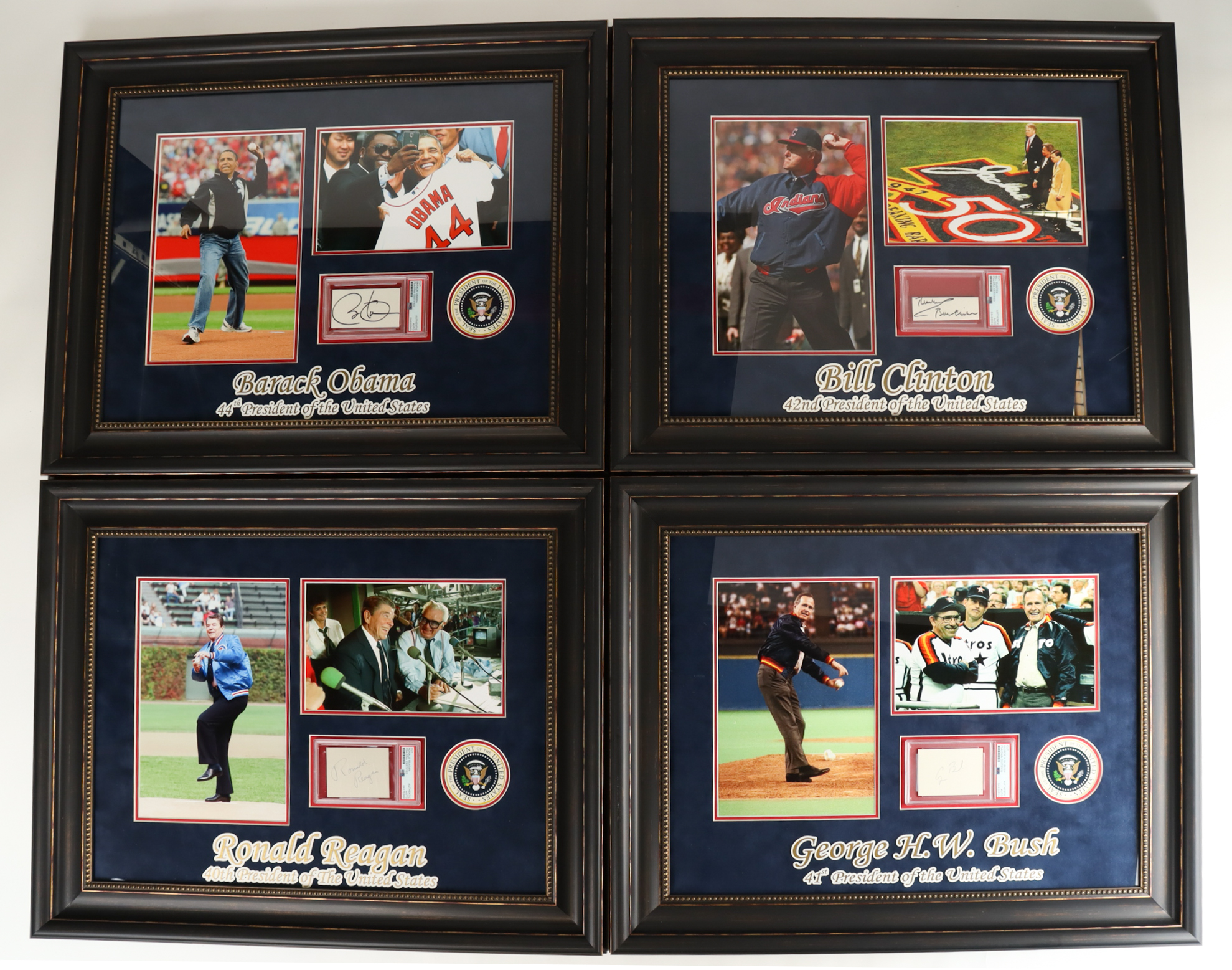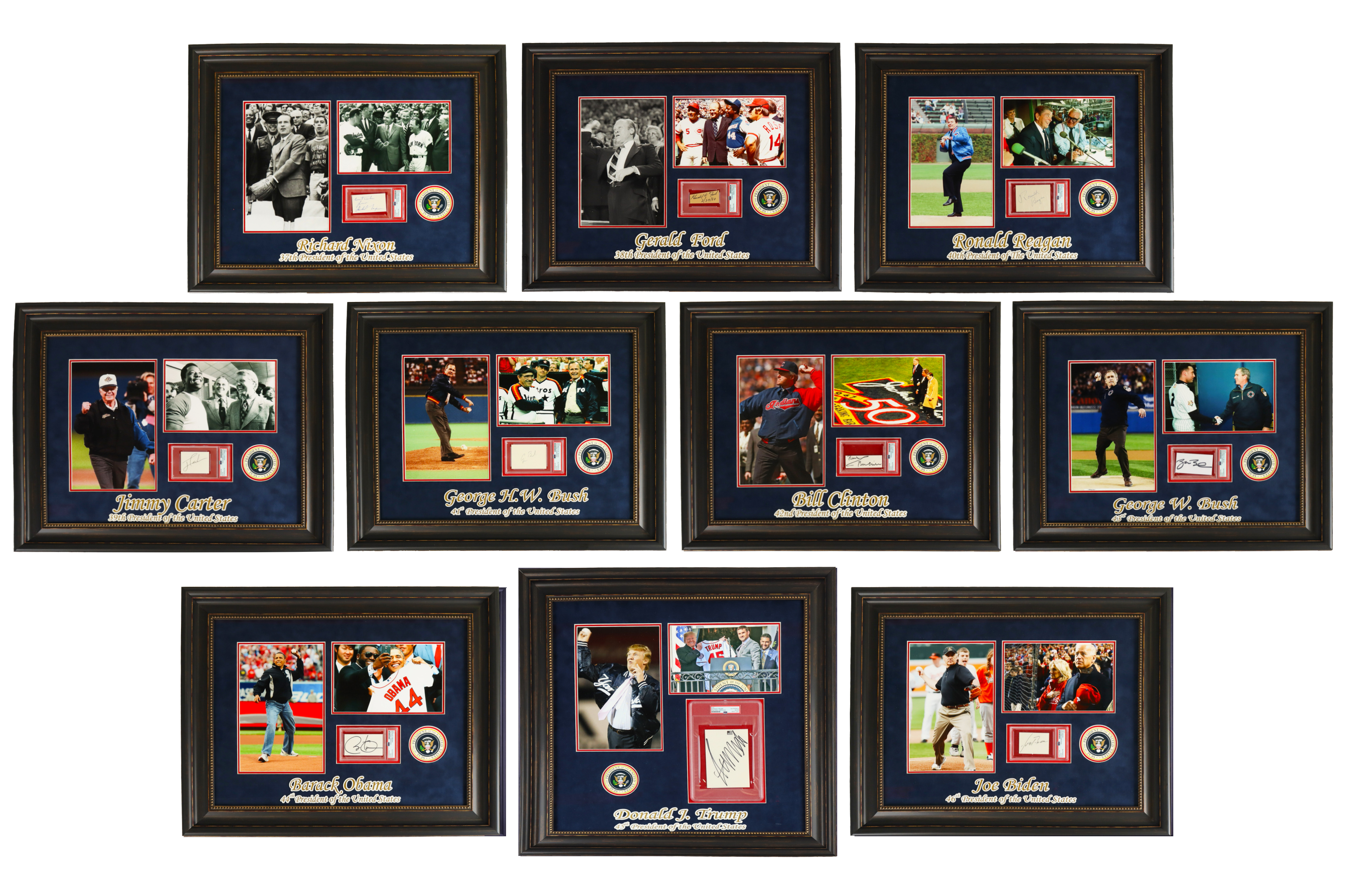 Set of (10) MLB Presidential "First Pitch" Custom Framed Cut Displays with Donald Trump, Joe Biden, Barrack Obama, Bill Clinton, Ronald Reagan (PSA)