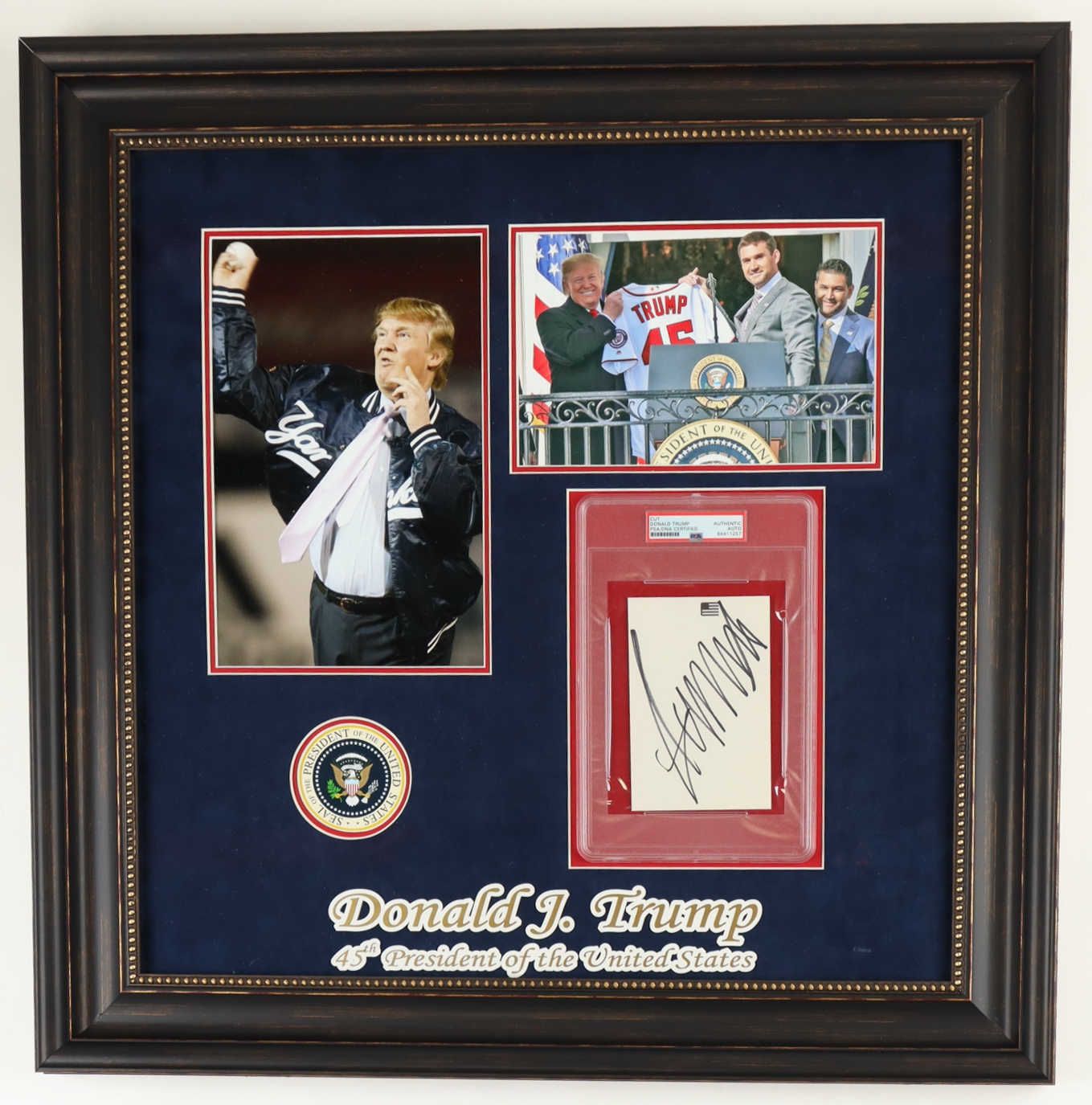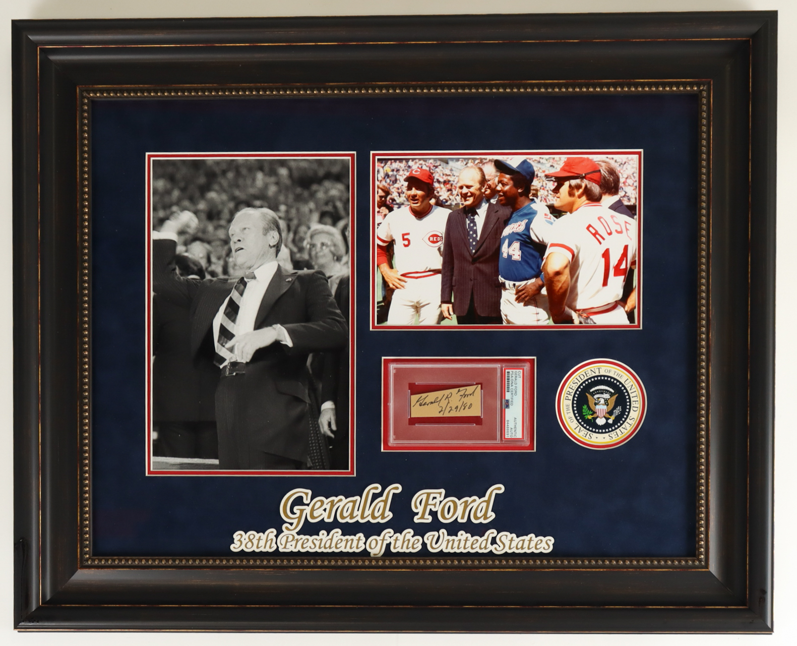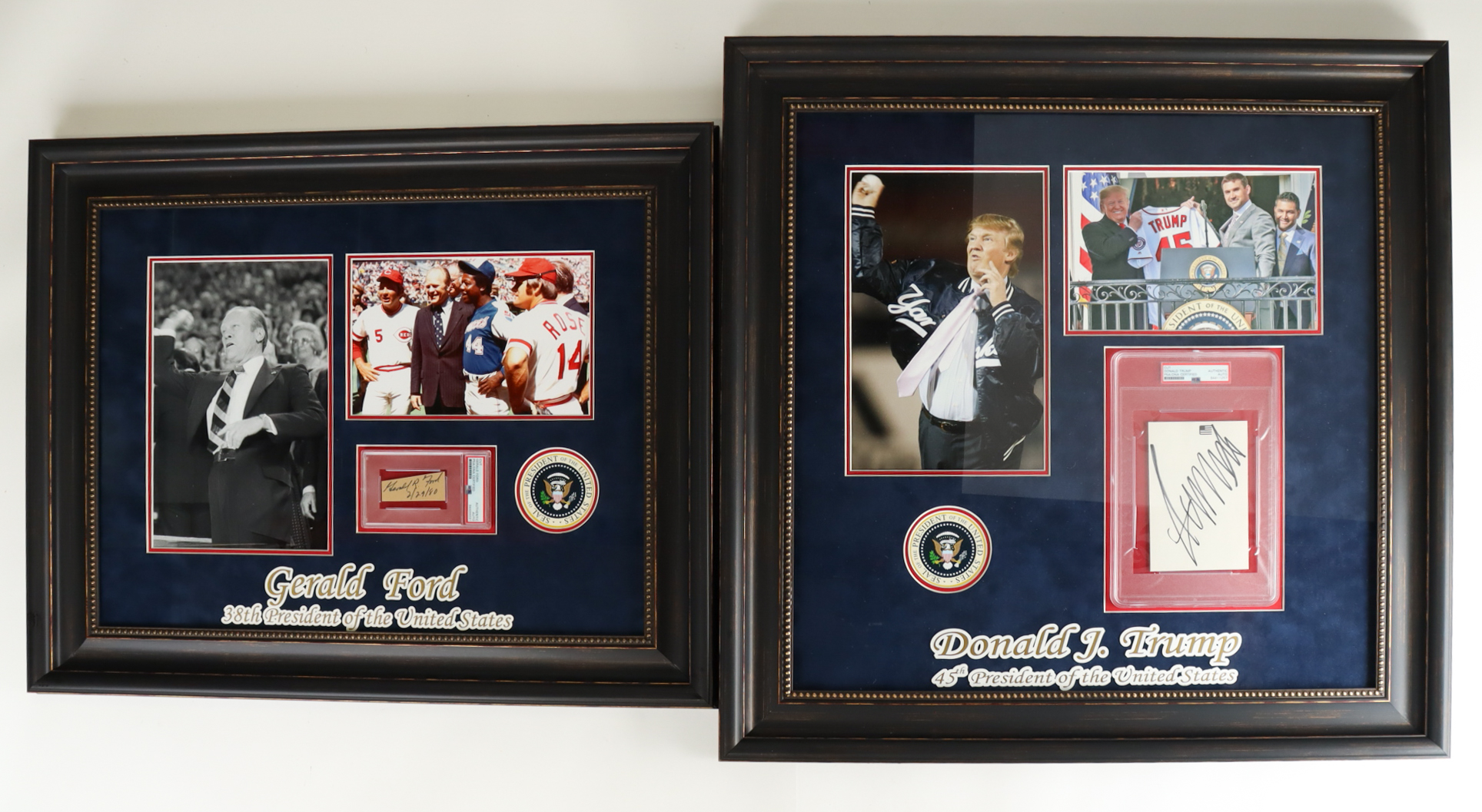 Set of (10) custom framed cut displays from the last (10) United States Presidents. Each frame measures approximately 29" x 24" in size, and feature cuts that have been hand-signed by Donald Trump, Joe Biden, Barrack Obama, Bill Clinton, Ronald Reagan (D. 2004), Gerald Ford (D. 2006), Richard Nixon (D. 1994), Jimmy Carter, George W. Bush, and George H.W. Bush (D. 2018). Please note, the Donald Trump frame is slightly larger than the other frames, and measures approximately 29" x 29" in size.