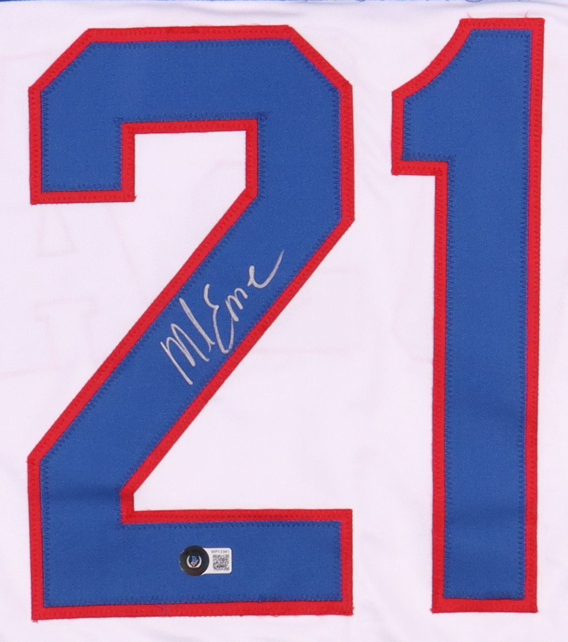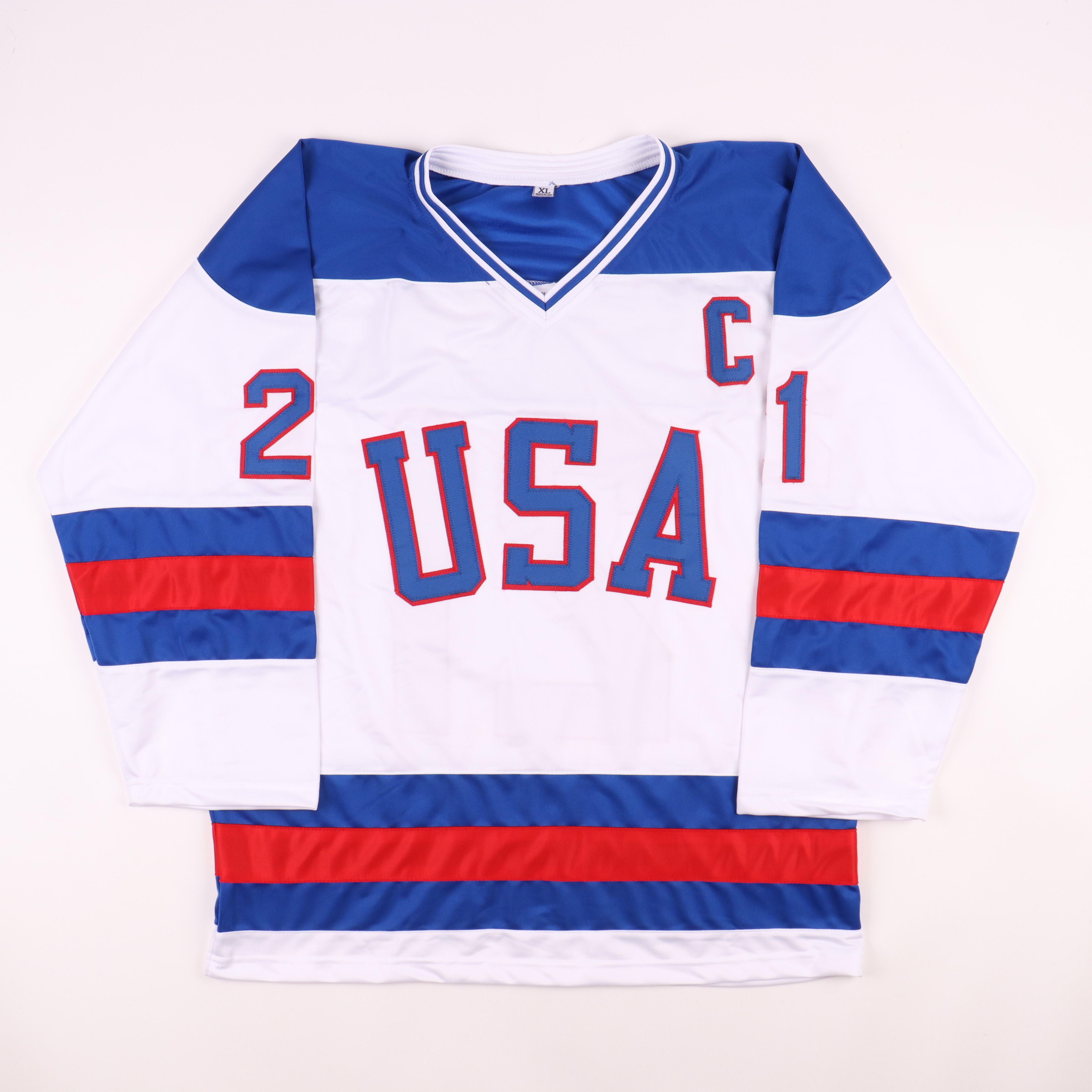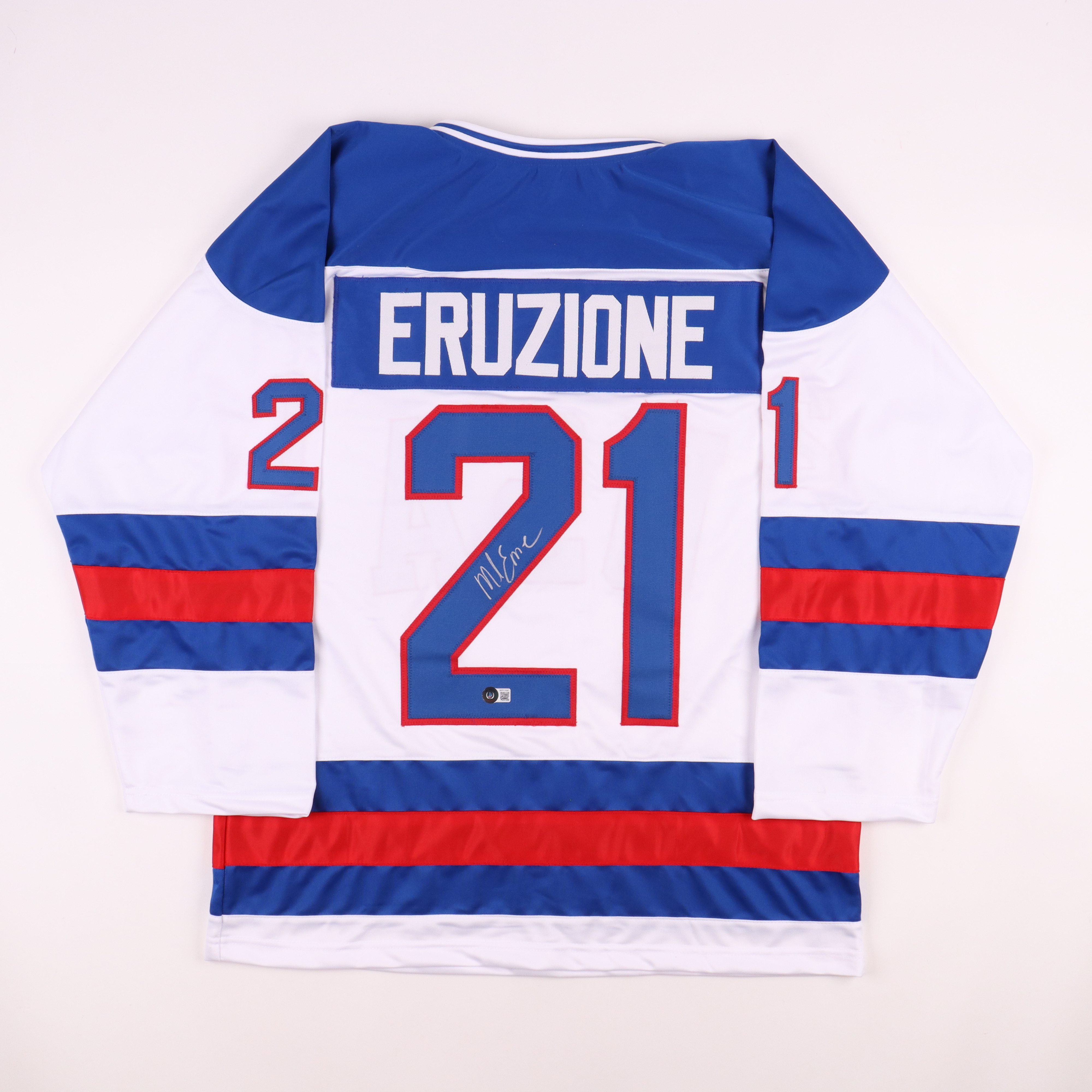 Custom on-ice style jersey. Everything is sewn on, size XL. Hand-signed by Mike Eruzione.
