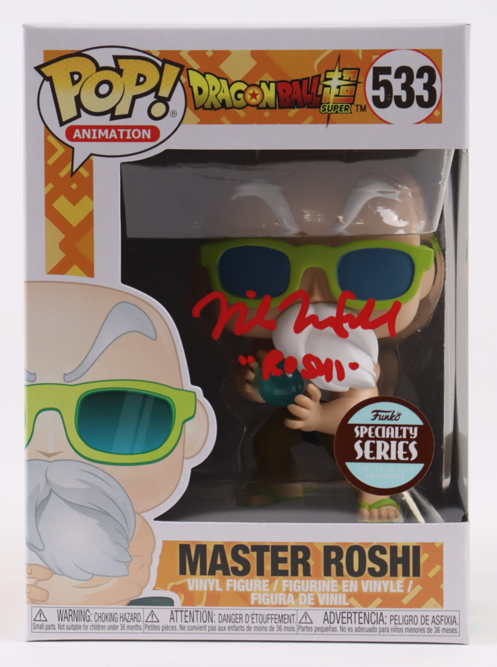 Funko Pop! vinyl figure measures approximately 4" tall. Hand-signed and inscribed on the packaging by Mike McFarland (Voice of Master Roshi).