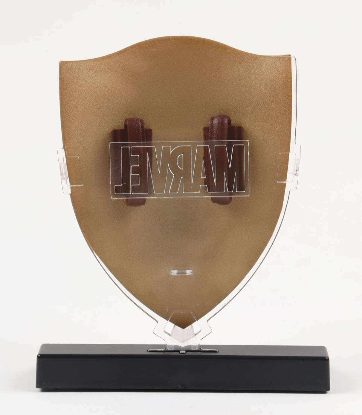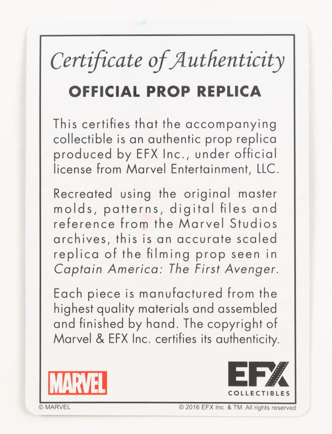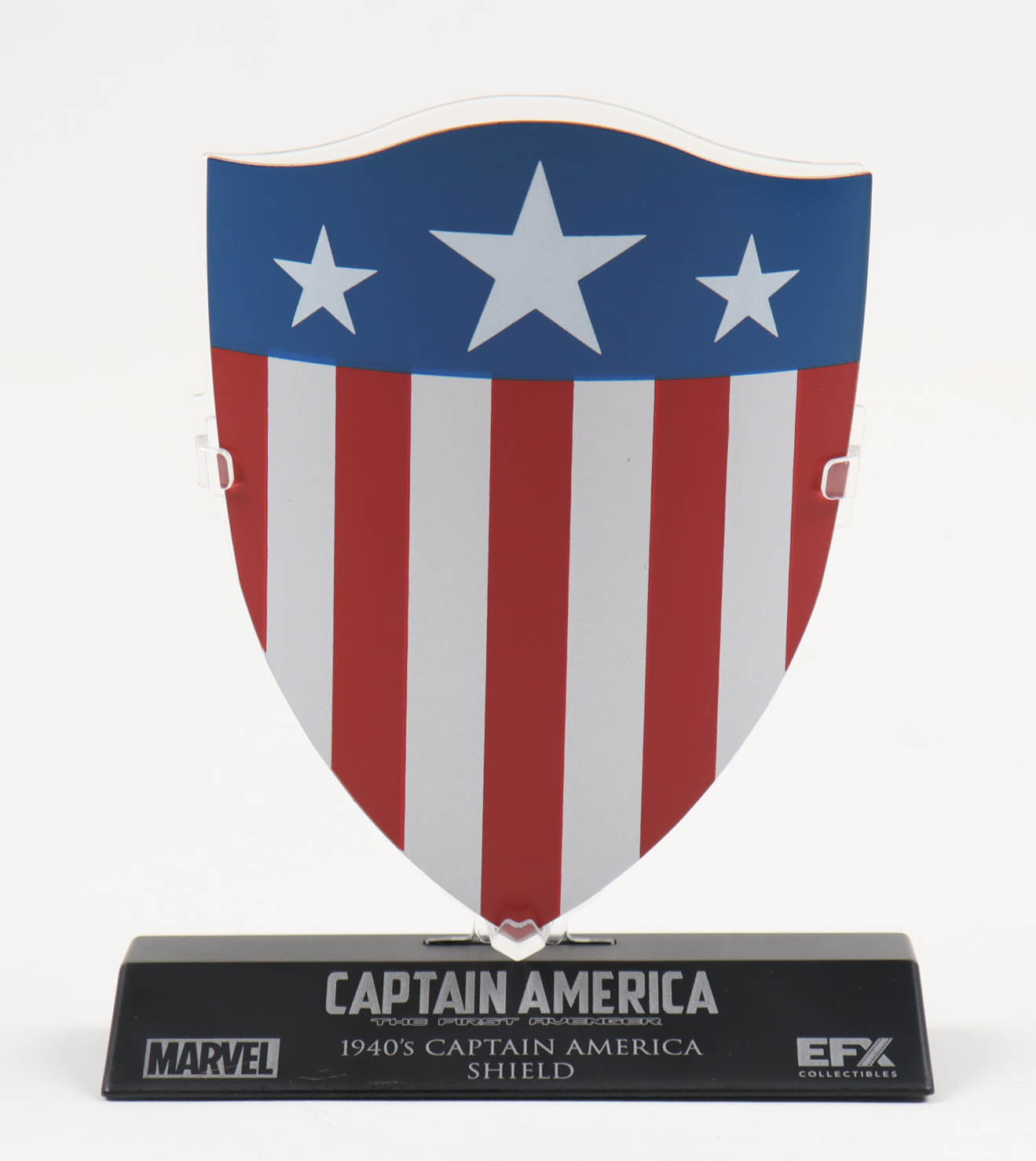 EFX miniature 1:6 scale "Captain America: The First Avenger" 1940s shield prop replica. Measures approximately 5.5" tall with the stand. Created using the original digital files and reference materials from Marvel Studios.